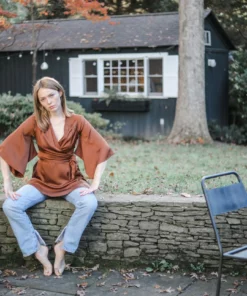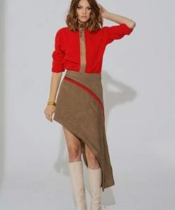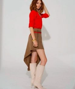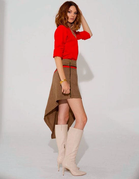 Nothing says edgy elegance than an asymmetrical look. The new herringbone skirt is high/low from side to side with a full length heavy gold metal zip down the side. The stylized asymmetrical yoke gives you a flattering feel and the matte red silk trim is striking against the caramel herringbone. Full of texture, this skirt pairs perfectly with the Rosie, Rosalyn, and red Jewell tops.