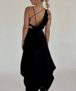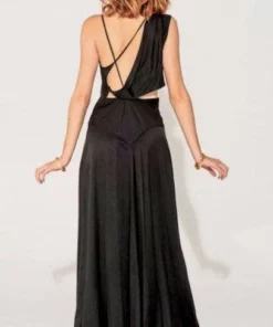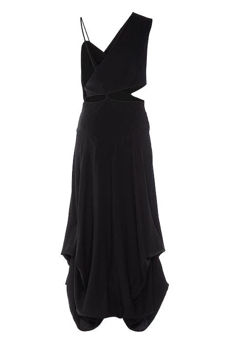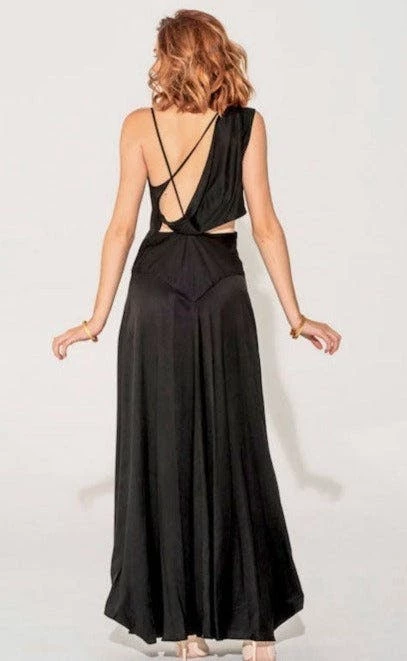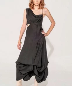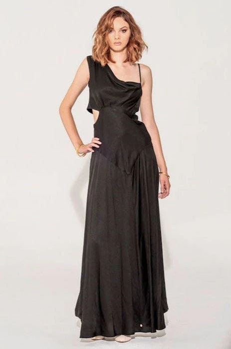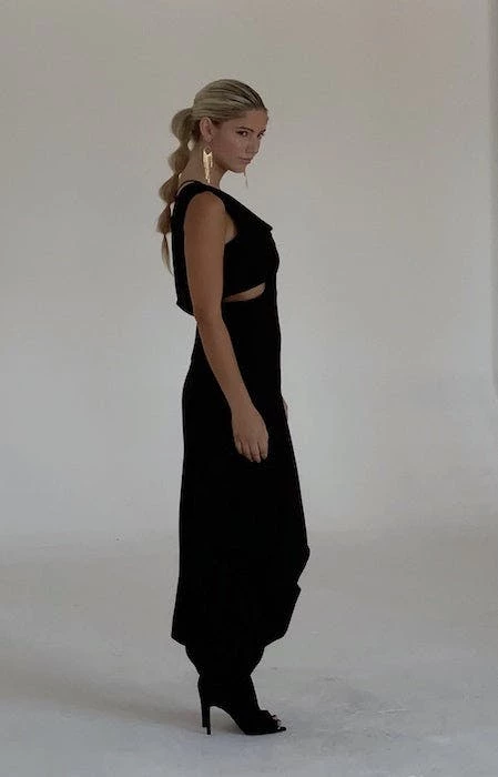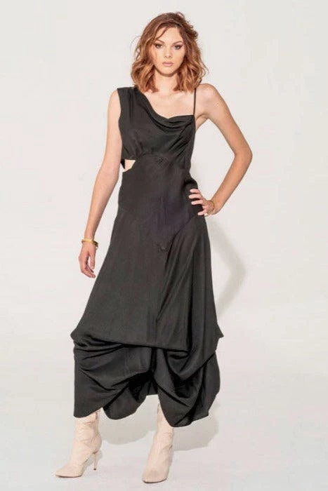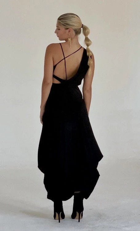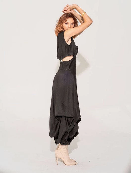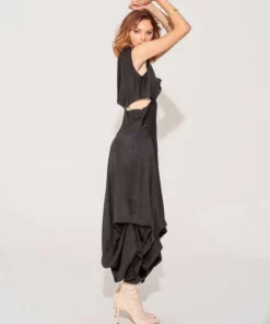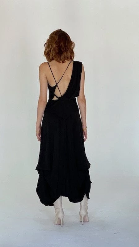 Stunning from the front to the back, the Aphrodite dress is Grecian inspired with an asymmetrical bodice on a bias drape. With a loosely draped open back and an optional bustle hem, you can wear this dress from the beach, to a lunch, on a date night or at a special event. Bustle or unbustle her and pair her with boots, heels or sandals. The fit is relaxed.