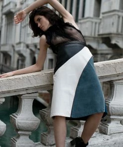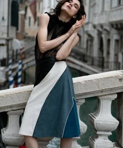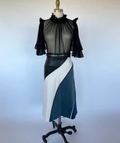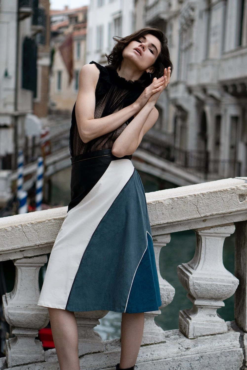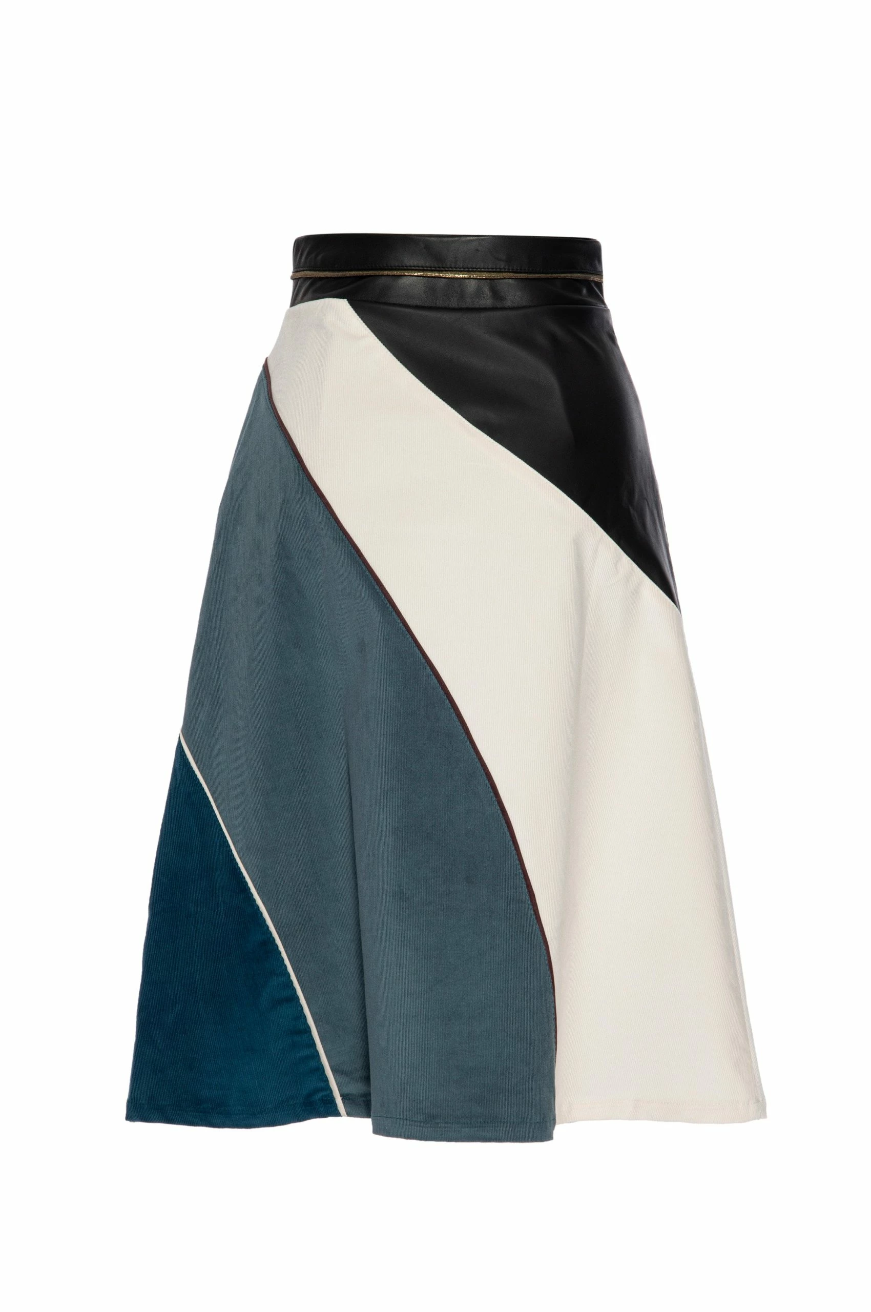 Tying a little retro and a little glam into the new sueded corduroy and leather skirt. The curved style lines are flattering while the plethora of detail keep your eye dancing. From the gradation of ocean teals to the smoothness and slight sheen of leather to the gold lamé and cabernet piping, this skirt can take you from day into night. With its higher waist and an a-line fit, the Harper skirt is a stand out statement piece. Not typically found, the back and front mirror each other. Fully lined with a side zip.