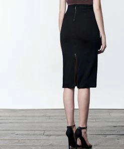 Curve hugging, high waisted, below-the-knee, suck you in pencil skirt with back metal zipper detail at closure and slit. The back zipper slit allows you to make your skirt as proper or daring as you choose to be.