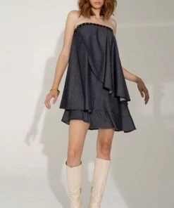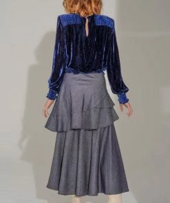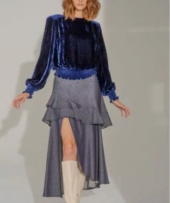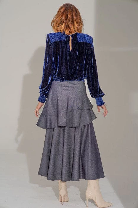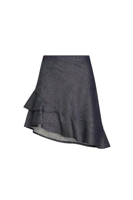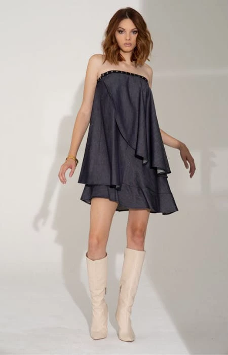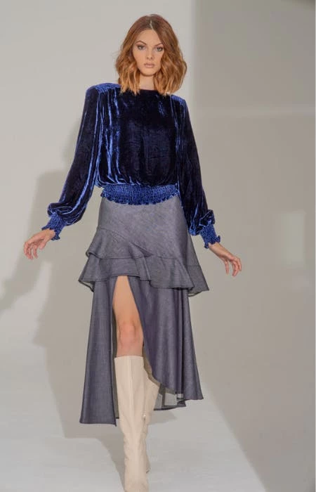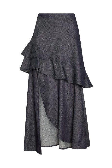 Designed with sustainability in mind, the Pandora skirt can take you from day into night and everything in between. Worn as a mini skirt, the upper skirts asymmetrical hem gives an optical illusion of a slender lengthened leg. Worn long, it’s the perfectly paired with a sweater and boots for the fall. The lower skirt may be detached by snap tape and worn as a few different tops and a skirt on its own. With multi functionality, this skirt is a definite a travel winner. Shown here in denim.