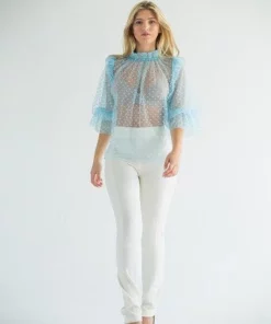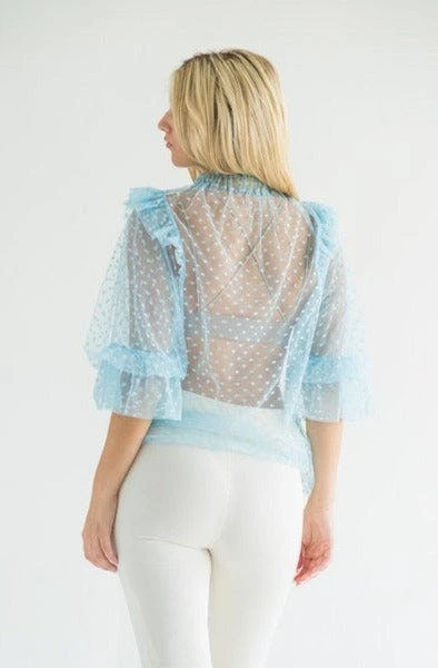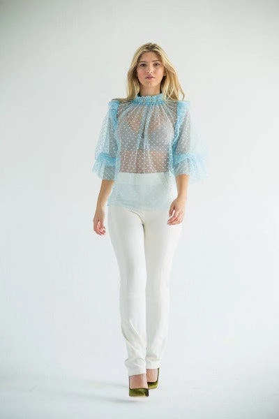 Feel light, free, and unique in the new PARKER blouse. This blouse is made in an upcycled polka dot mesh in an angelic powder blue. Although it has a high ruffle collar, the elastic neck band is made to be loose around your neck. It features gathering in the front and back. The dynamic sleeves are double belled with a small ruffle at the high shoulder. She is perfect with the new cream SHILOH pant. This top is made from upcycled material with a very limited quantity.