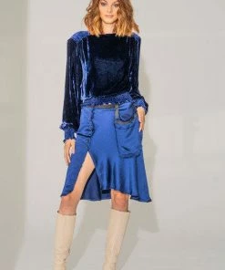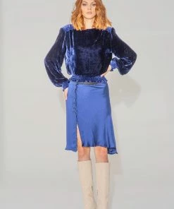 The touch of the Sabine skirt is beyond compare. Made in an upcycled cobalt sateen this slinky skirt wraps around your body and closes with antique brass metal ball buttons down the center of your leg with the skirt curving around a slit. The metal buttons end mid-thigh for a peek-a-boo slit. Sabine also features a detachable sack pocket which is edged in black gross grain ribbon. The waistband is made in a contrasting black twill. All inside finishes are french seams. Pairs perfect with the cobalt Mary Jane or striking with the Rosie lace top.