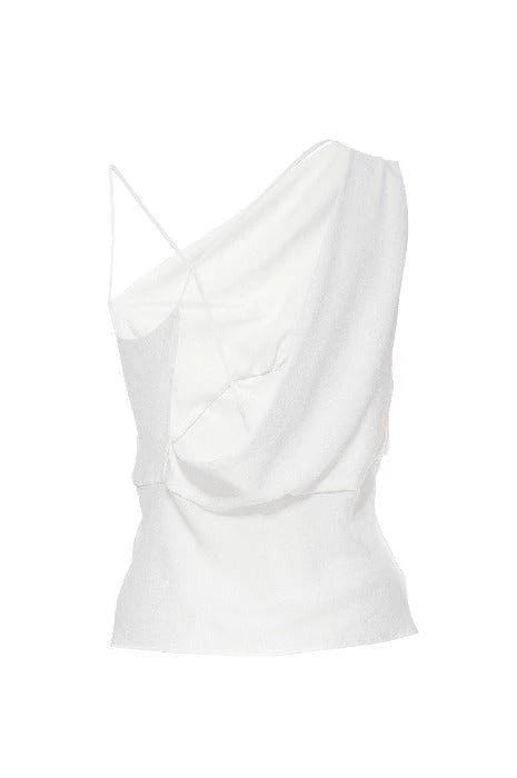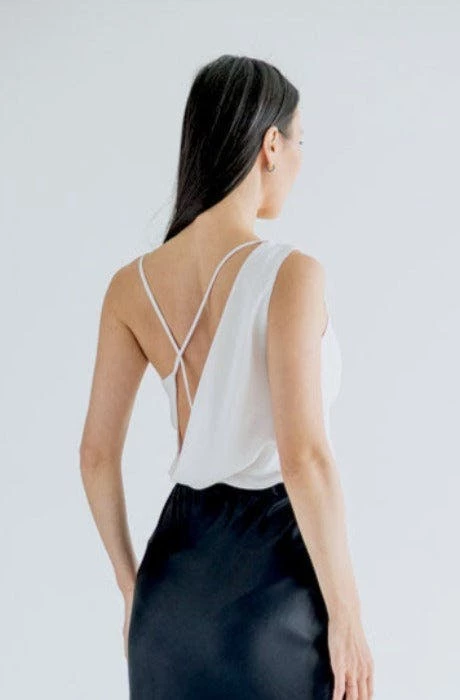 The Thalia blouse is just as stunning in the back as it is in the front. Loosely inspired by the Grecian pallium, this bias draped one shoulder blouse has an open strap back to give you a free, loose and breezy feel. Slip her on for instant sex appeal and pair her with any bottom. Shown here with the Hematite Skirt. Top is doubled at the bodice for opaqueness.