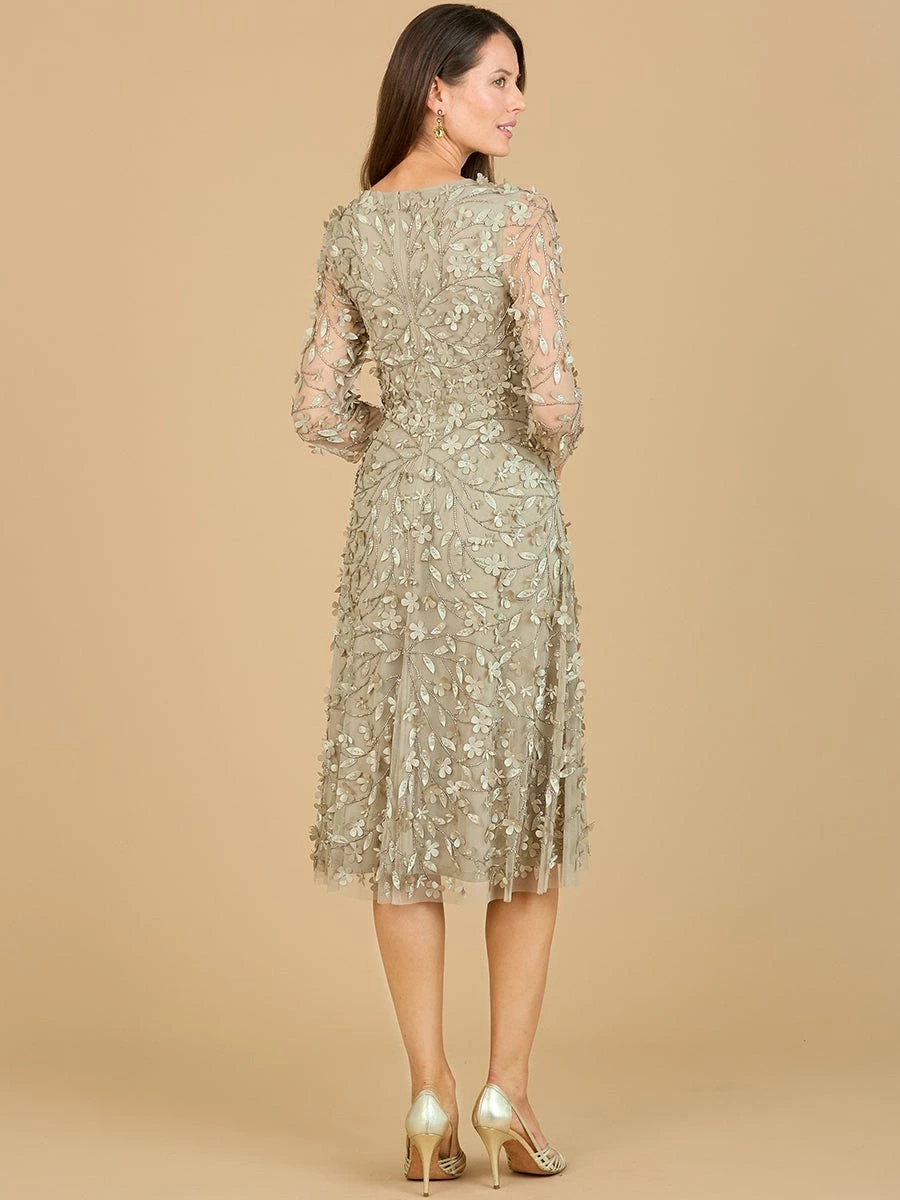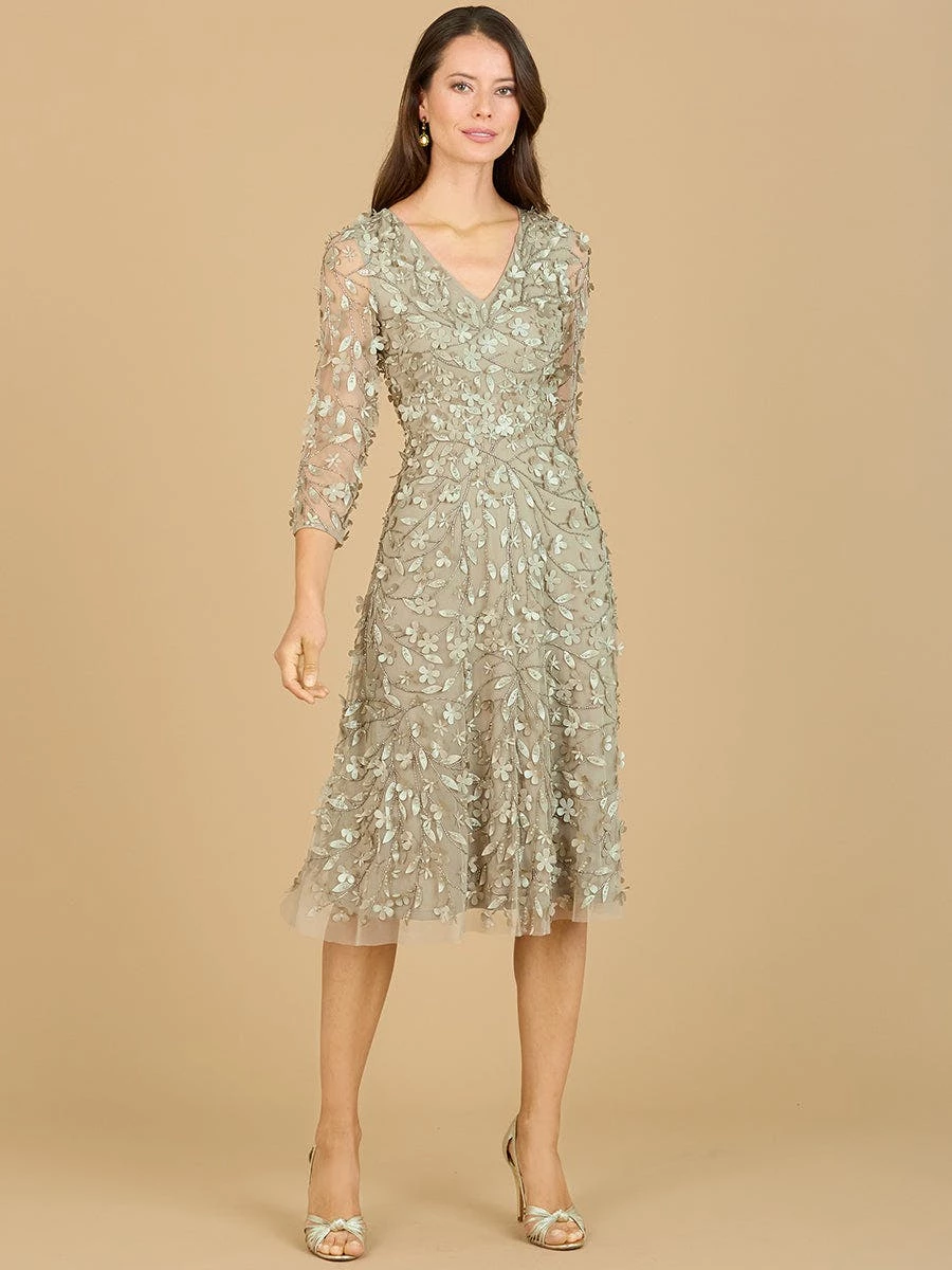 Beaded V-neckline midi dress with 3D cutout Embroidered & beaded appliques. This dress features a long flowing A-line silhouette for an elegant sequined Midi look. It’s the perfect dress for a wedding guest or mother looking to stand out.