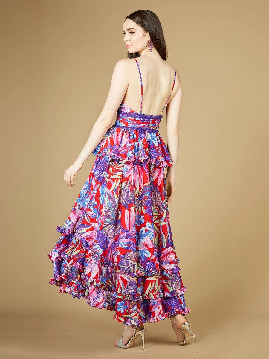 Show off in this spaghetti strap floral dress with a gorgeous lace up back. This beautiful red & purple based print combined with the ruffled skirt creates a timeless and classy look for any event. It is attention-grabbing and so unique.