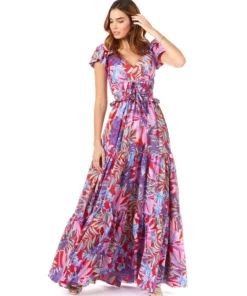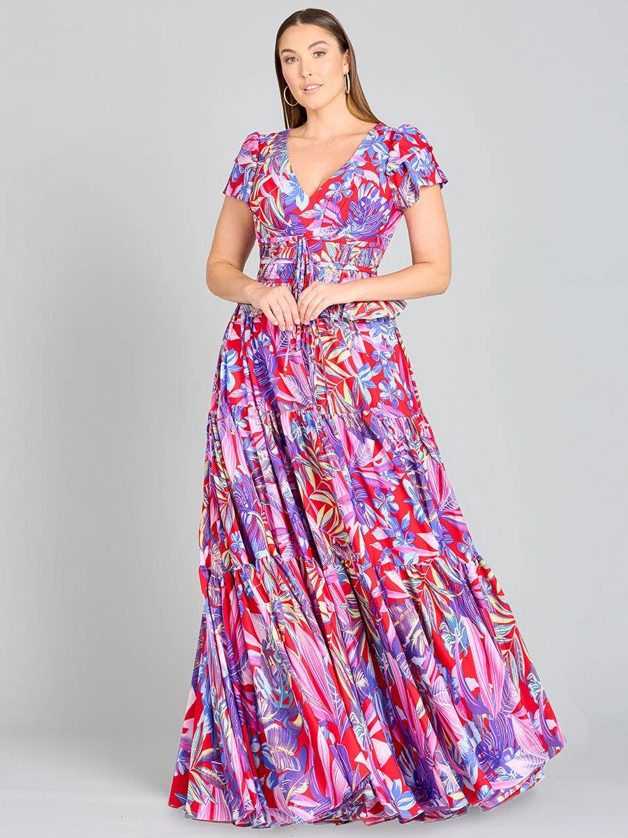 This is an A-line print gown with V-neck straps in a floral pattern with cap sleeves. The flutter details at the waist with bows are for additional support and a unique style. This is one of the favorite print dresses that are coming soon. It is simply perfect for a multitude of events and stunning for the soon to come tropical weather.