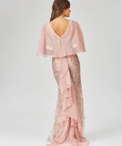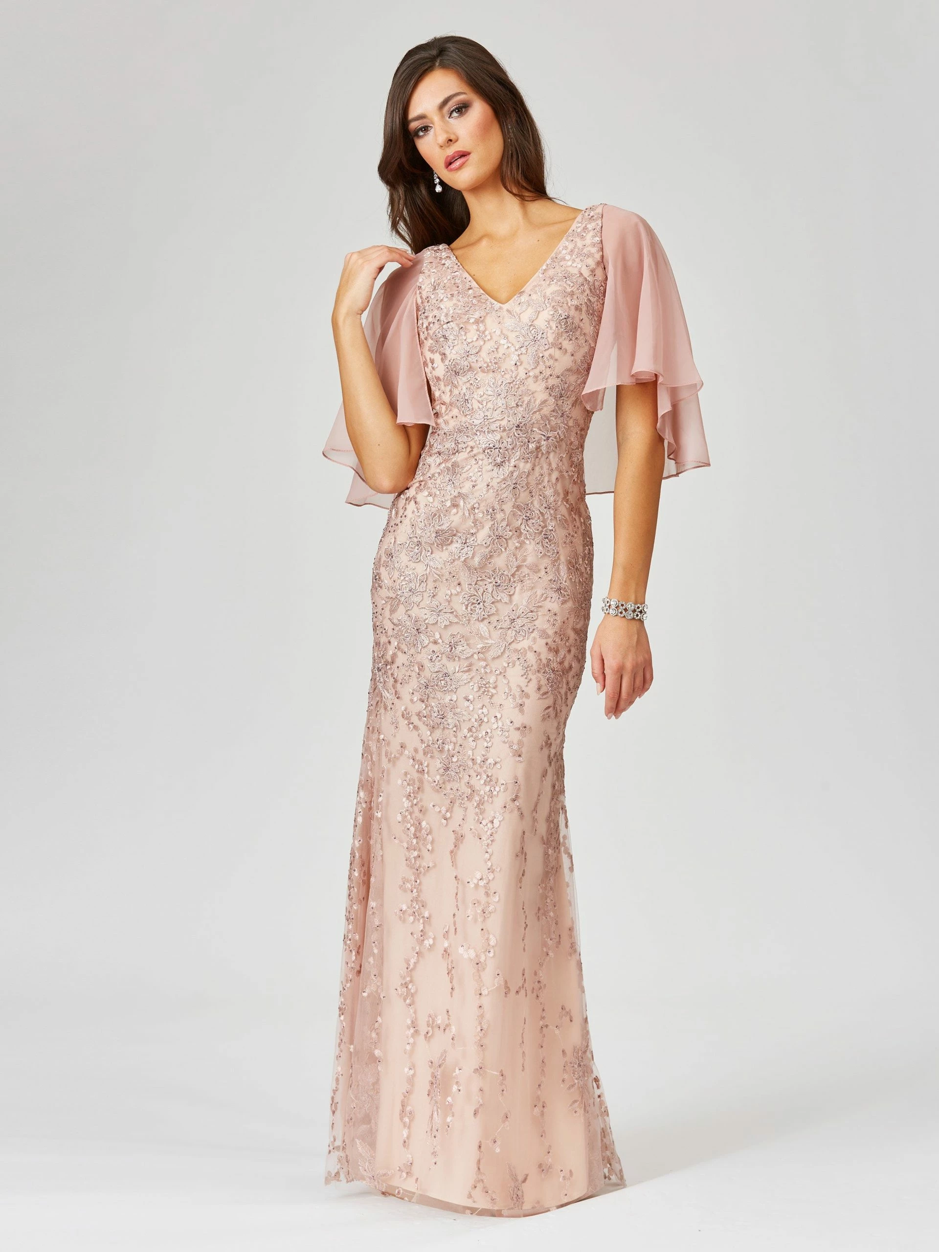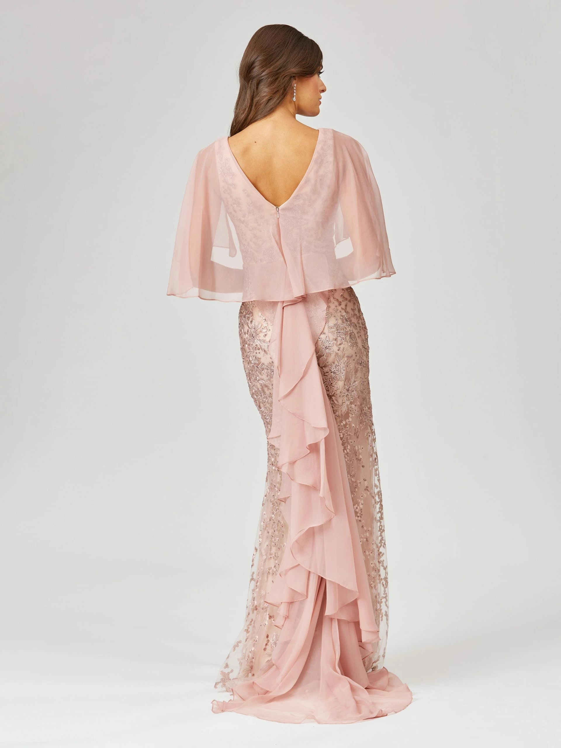 This sparkling lace mermaid gown features a v-neckline and modest fit. The flowing chiffon cape sleeves cascade down the back to create a gorgeous train.