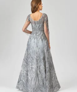 Long Sleeve Ballgown with a swirling lace pattern featuring a v-neckline and embellished bodice. Enter the gala and draw attention to this beautiful gown.