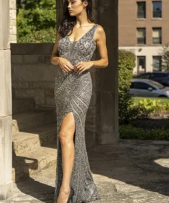 Fully embellished with seed beads and sequins, tulle fabric long dress v neckline sleeveless. With an open back, central zipper and thigh high slit. Wear this to your prom and be the star of the night.