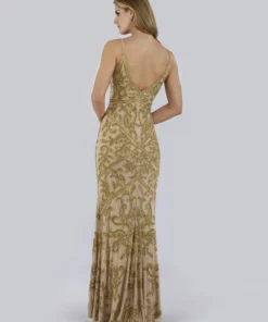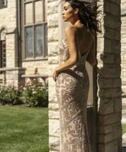 Sleeveless beaded gown with a showcasing v-neckline fitted through hips cascading into a flowing sweep train. Available in two colors.