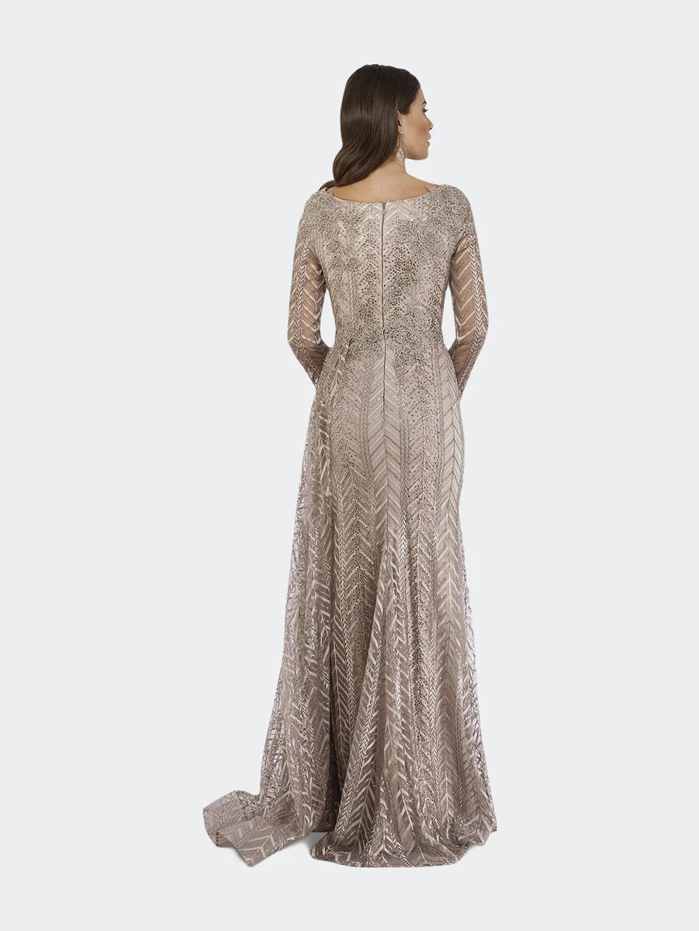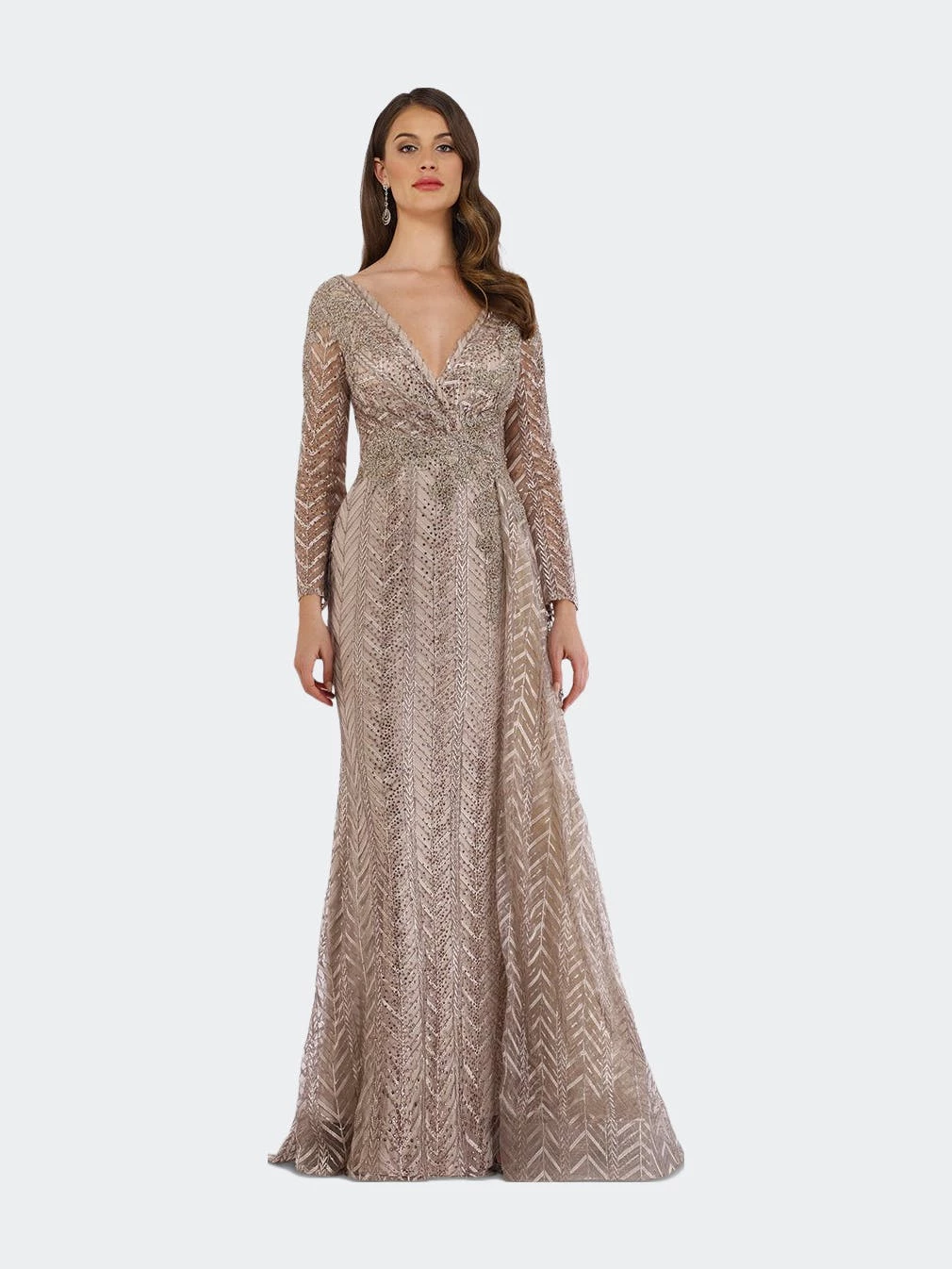 Full length lace dress with long sleeves, v neck dress embellished with rhinestones, lace appliques. It features a skirt overlay.