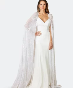 Beaded v-neckline sheath gown. The gown features long flowing cape details from the shoulders to create a flowing train. Beaded belt to create a cinched in waist.