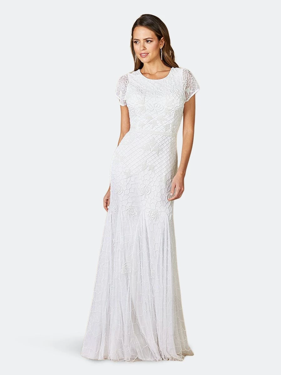 Beaded u-neckline sheath gown. The gown features long flowing mermaid fall details. Cap sleeve detail and godet at the bottom.