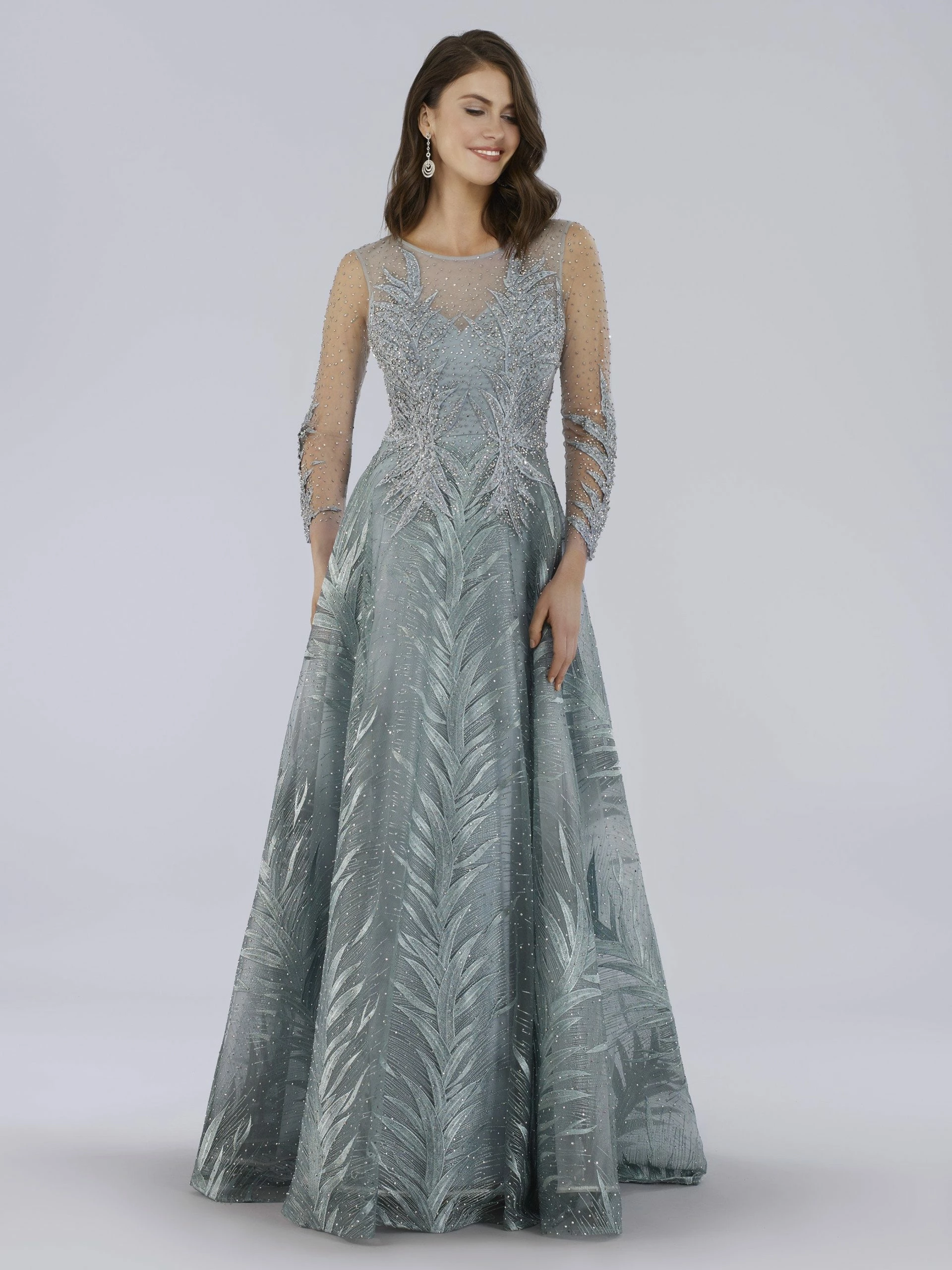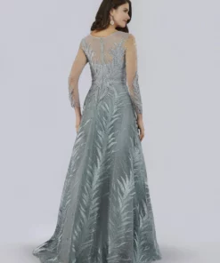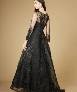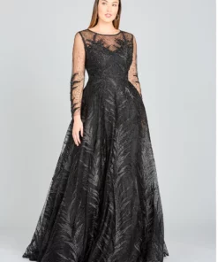 Lace ball gown with a high neckline covered in appliques and glittering stones featuring long sheer sleeves and a flowing skirt. One of the best selling styles now in two new colors, black and mauve.
