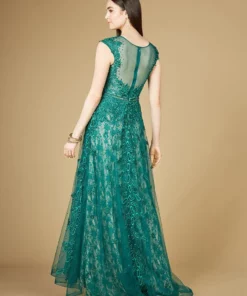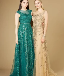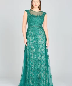 A renewed lara style from the past! One of the favorite styles is making a comeback and has been reimagined into this beautiful green and gold silhouette that works wonders on your body. Features a high neckline, cap sleeves and a beaded belt to bring in your waistline. Features an illusion back and back zipper. We’re so pleased that she’s back!