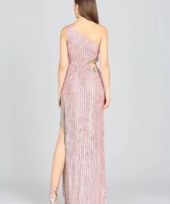 A one shoulder dress with beaded fringe on the slit and side cutout with sequins all over. It’s scary comfortable with the stretch beaded tulle and stretch lining.