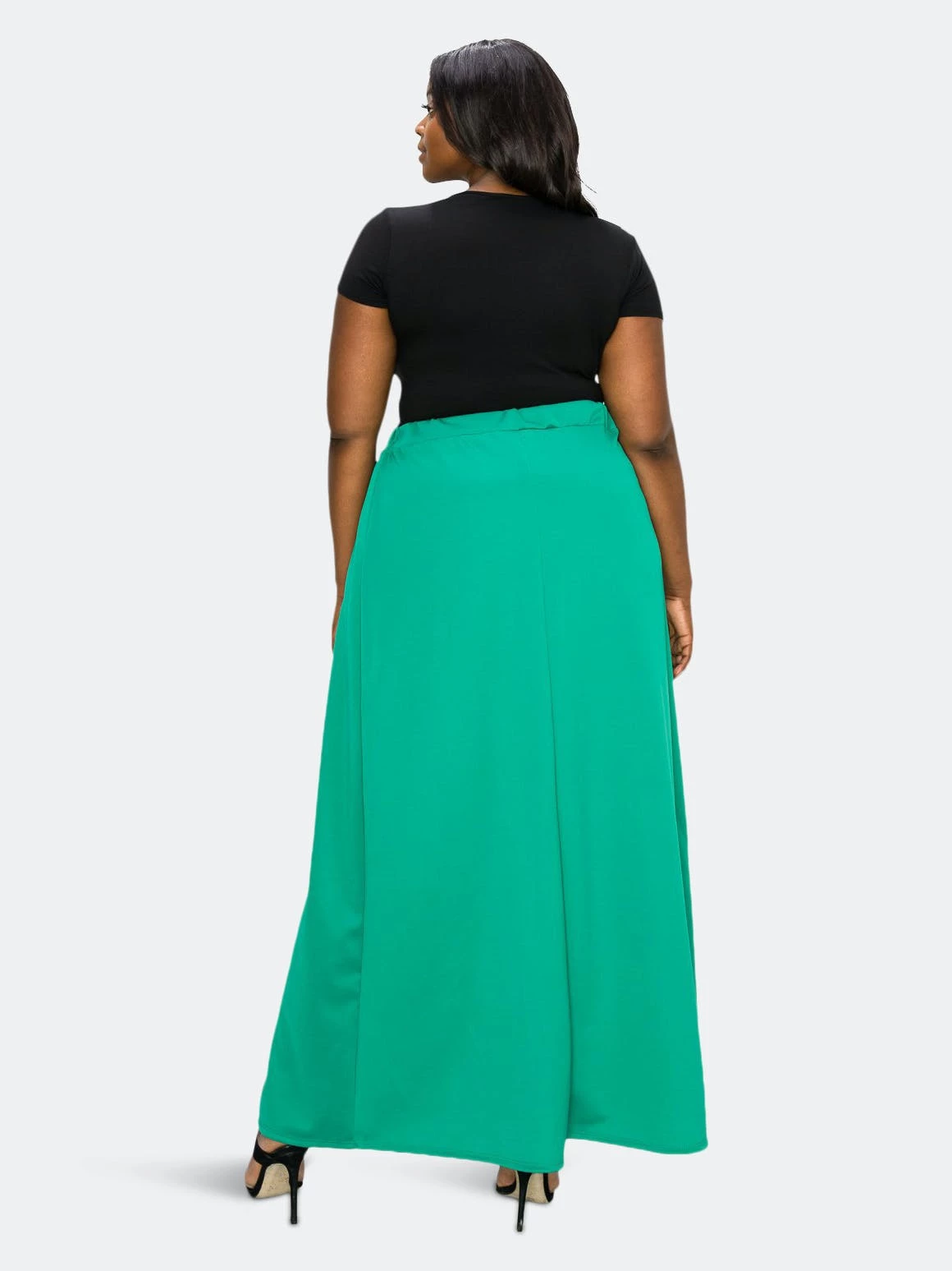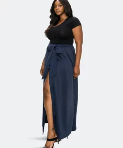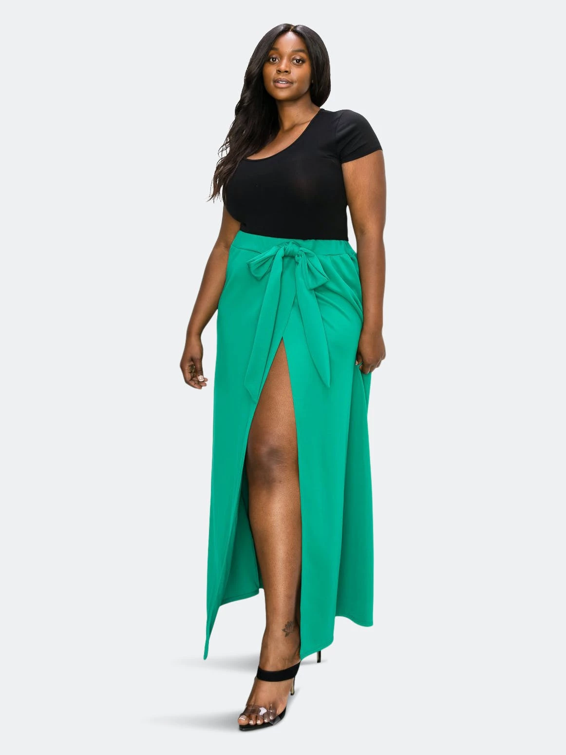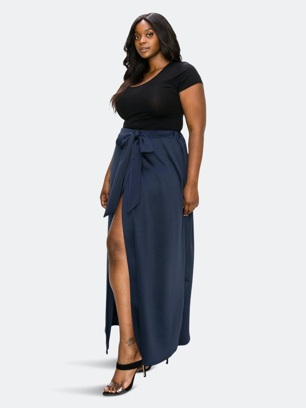 – Wrap skirt- Faux belt- Elastic waistband- Pull on closure- Maxi length- Forgiving and stretchy fabric- Made in USA- 95% Polyester 5% Spandex- Machine wash cold, tumble dry low