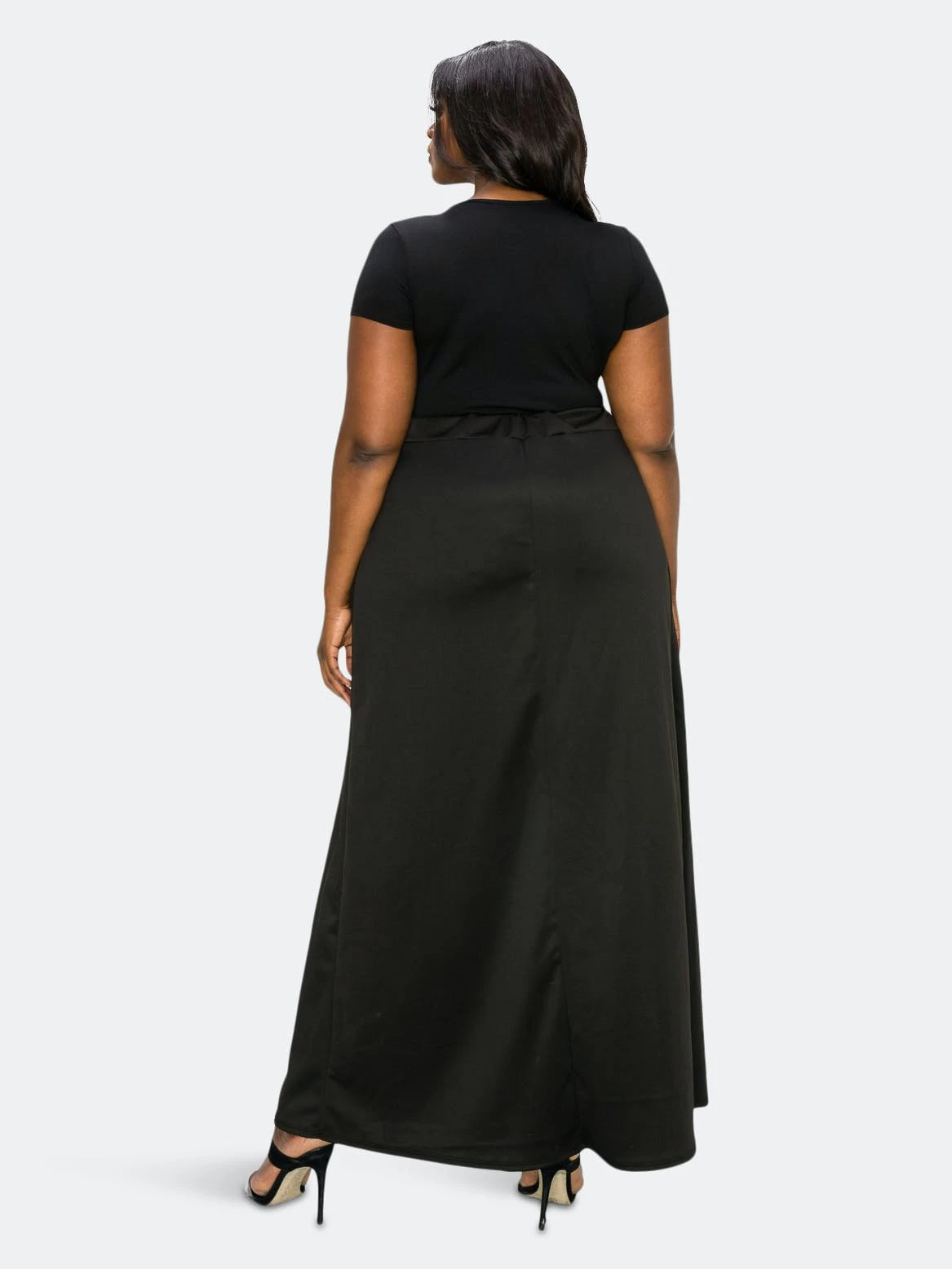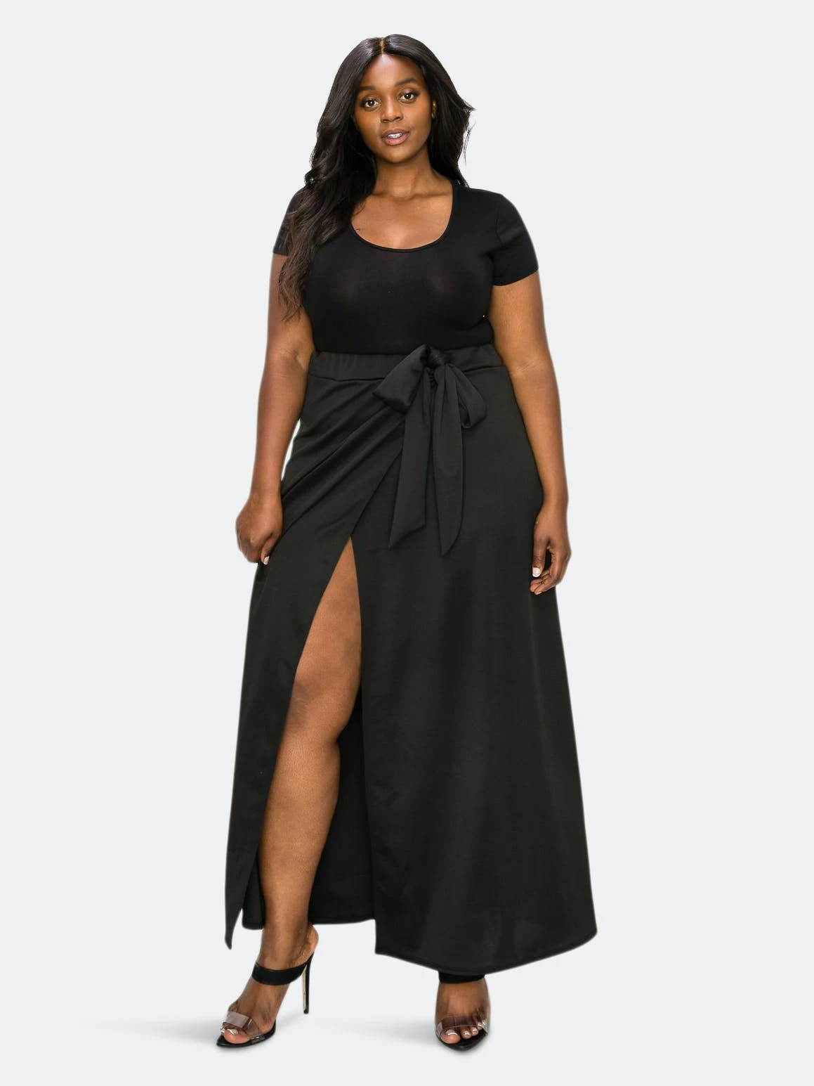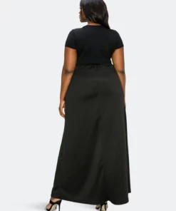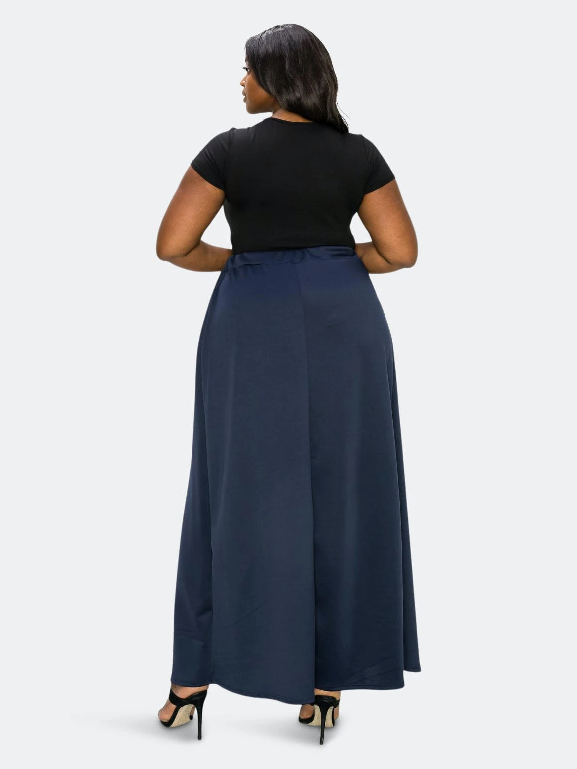 – Wrap skirt- Faux belt- Elastic waistband- Pull on closure- Maxi length- Forgiving and stretchy fabric- Made in USA- 95% Polyester 5% Spandex- Machine wash cold, tumble dry low