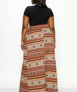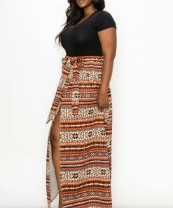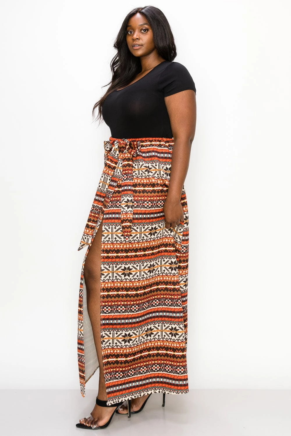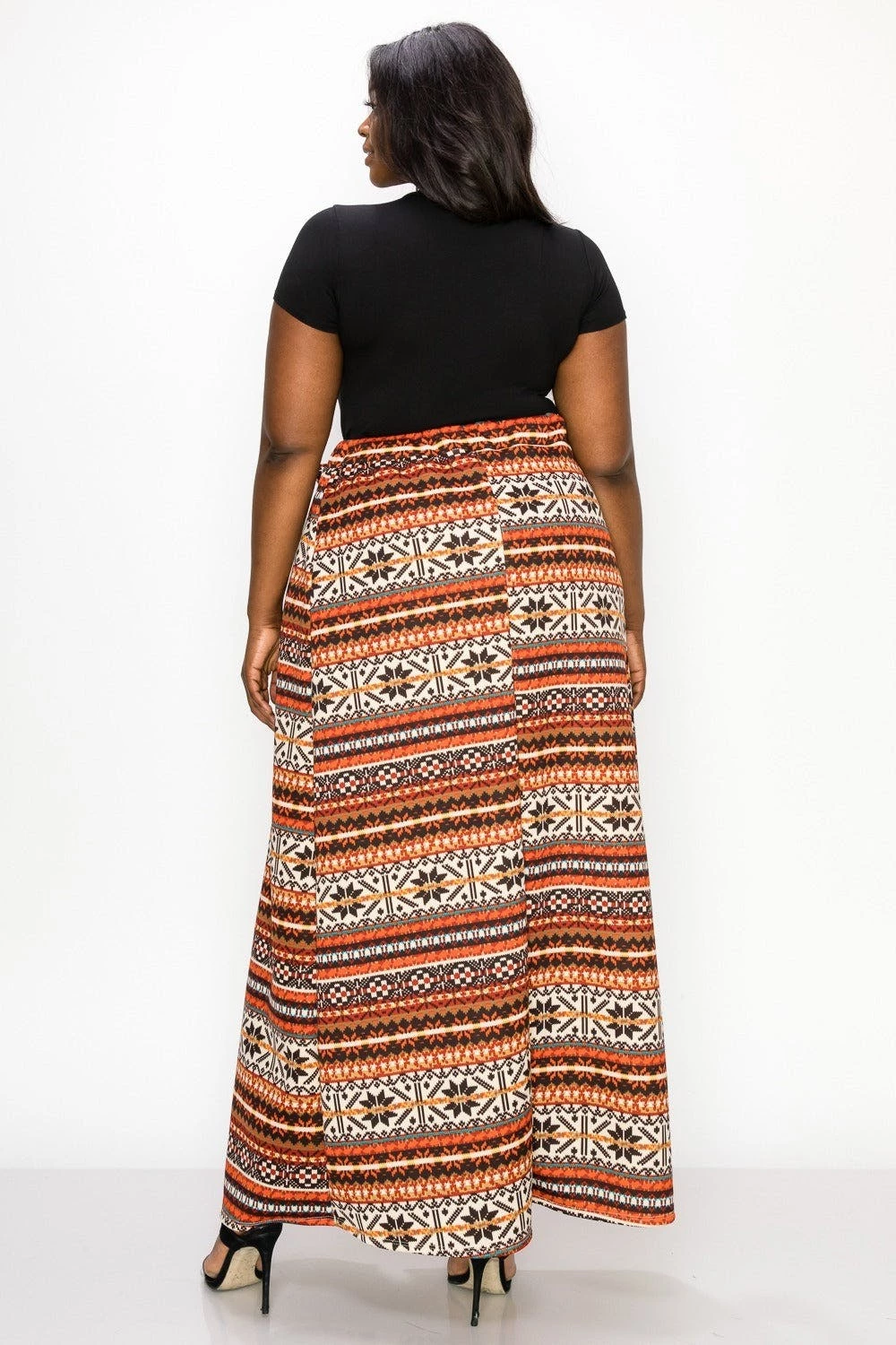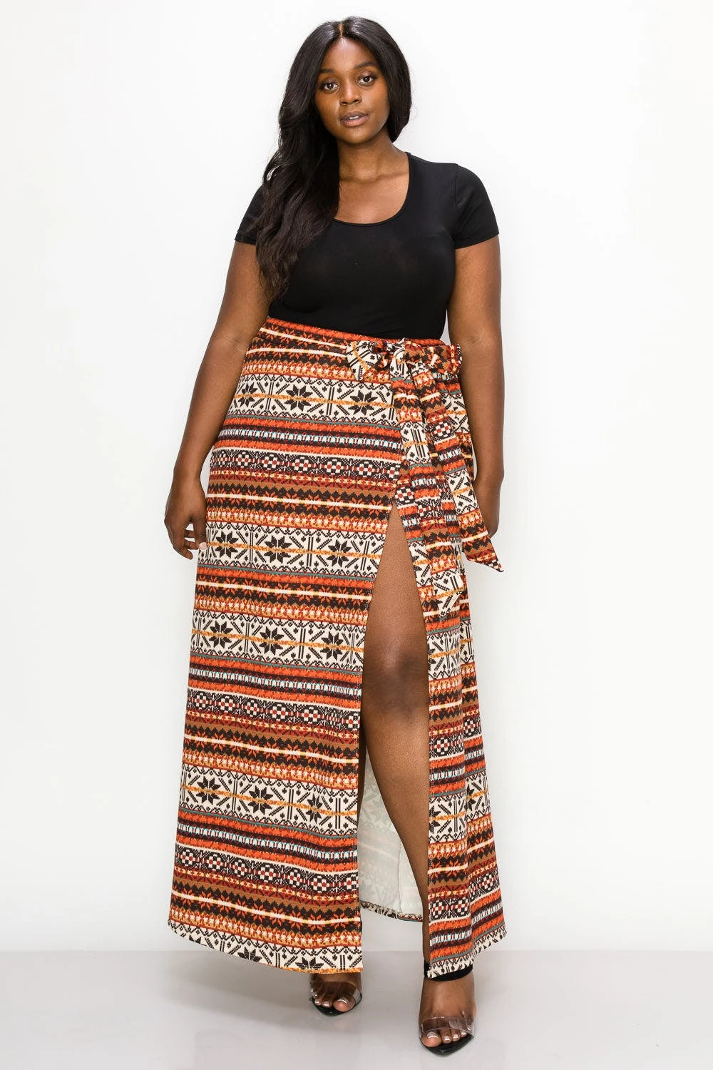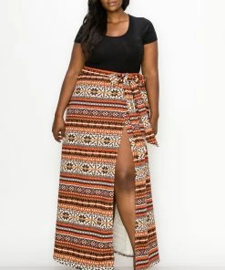 – Wrap skirt- Faux belt- Elastic waistband- Pull on closure- Maxi length- Forgiving and stretchy fabric