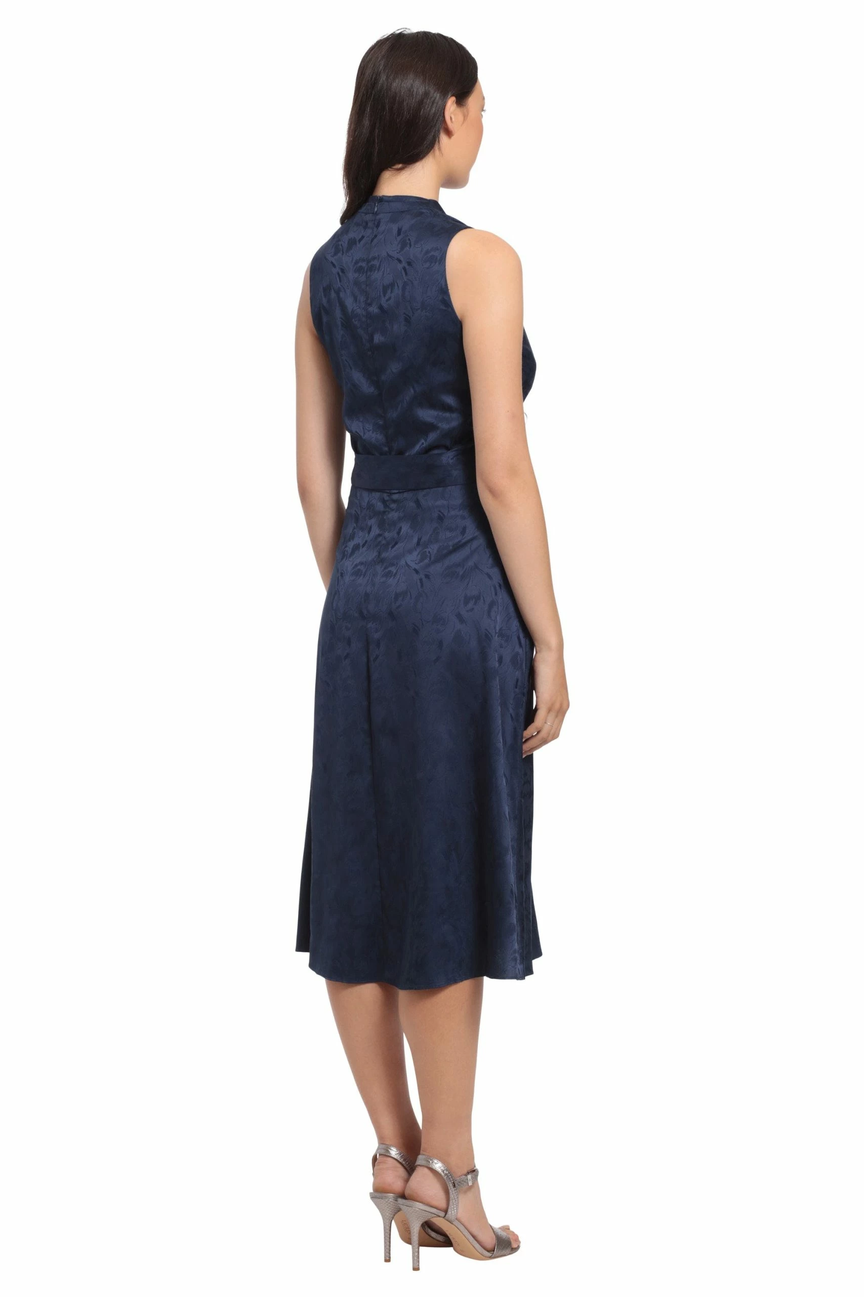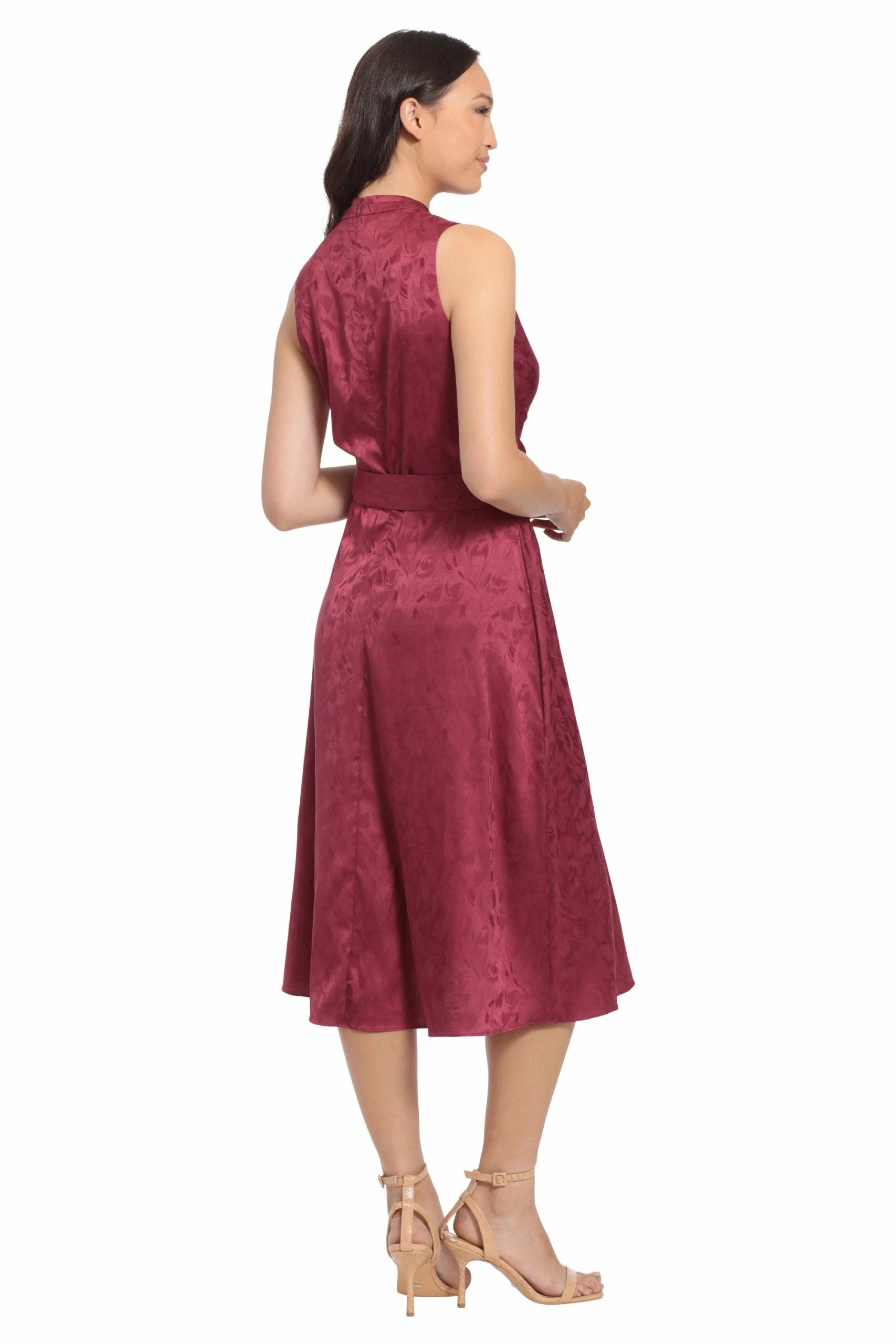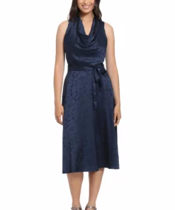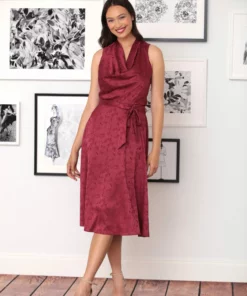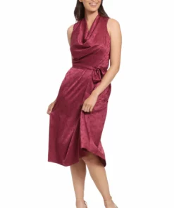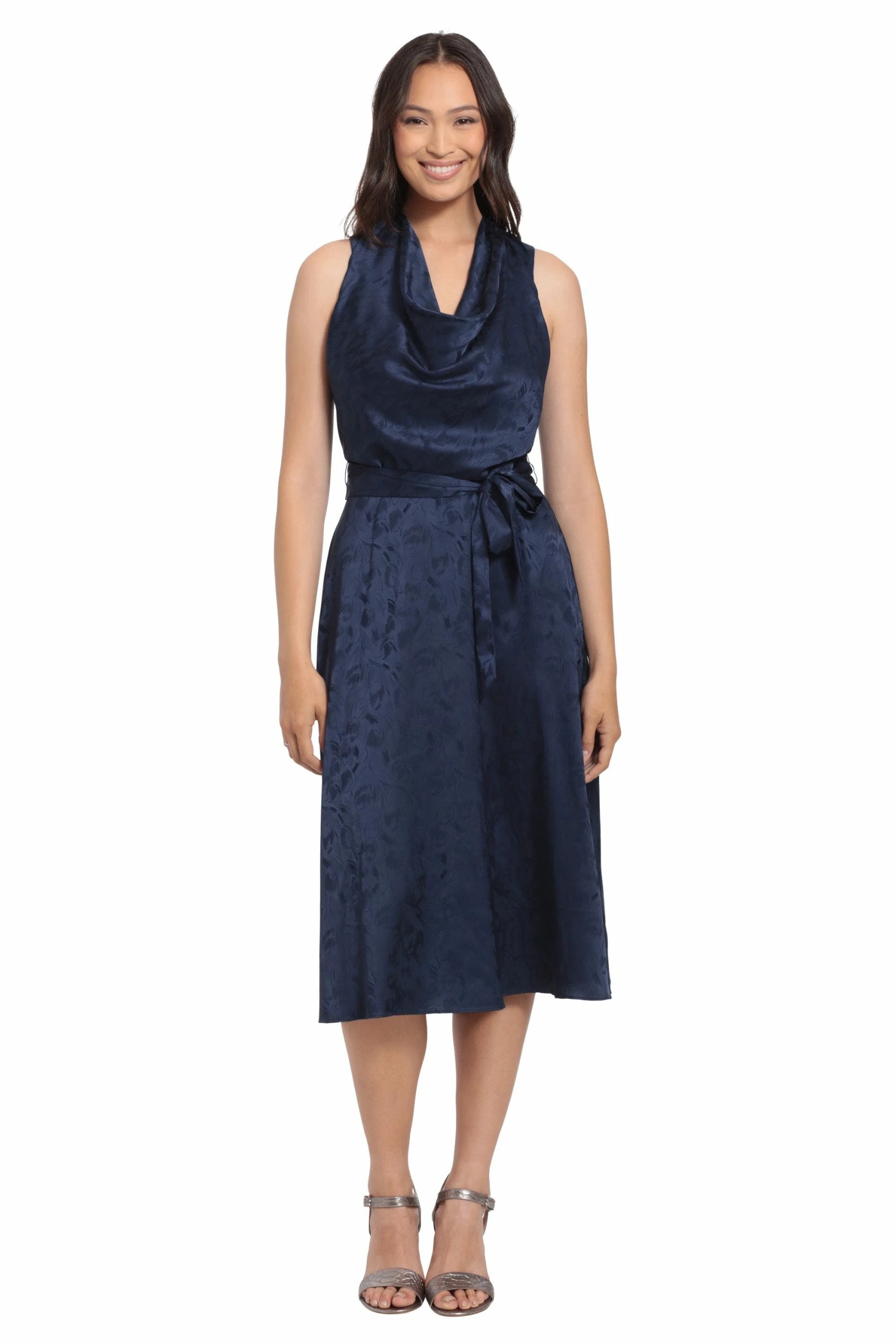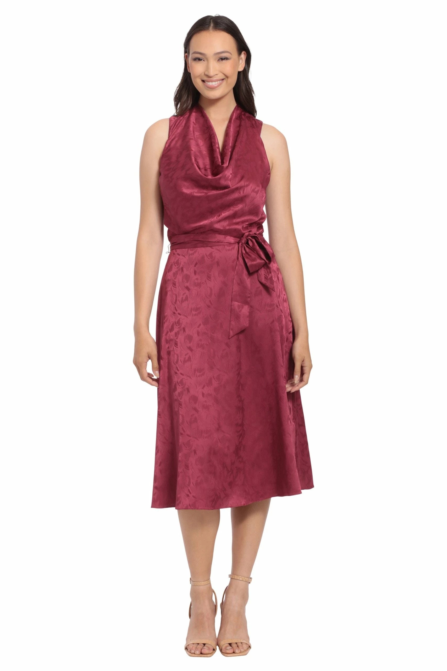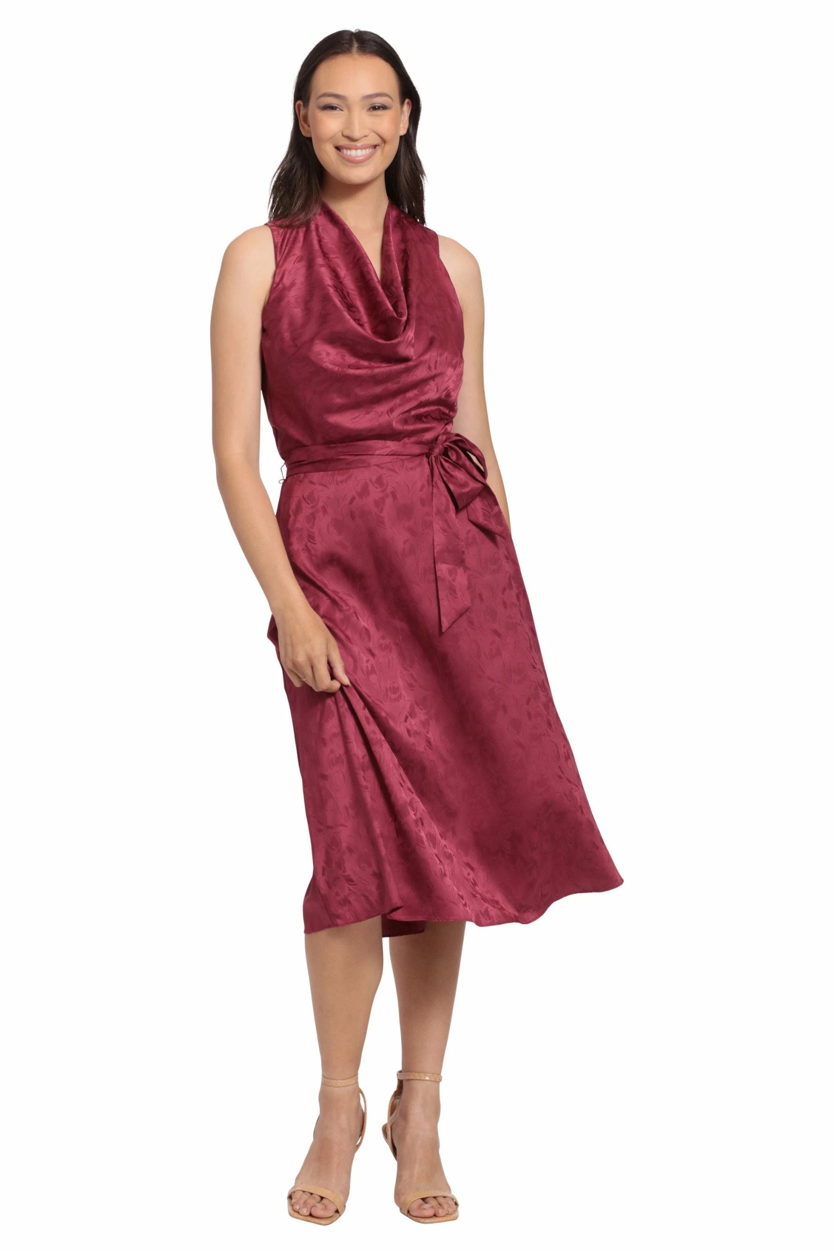 This draped dream midi is Dasia. We adore her blouson bodice, cowl neckline and waist sash.