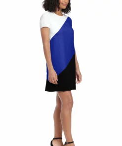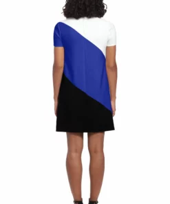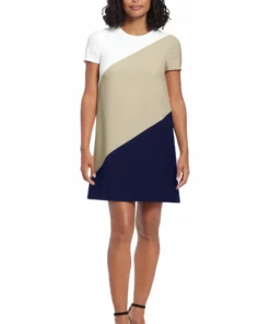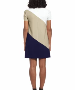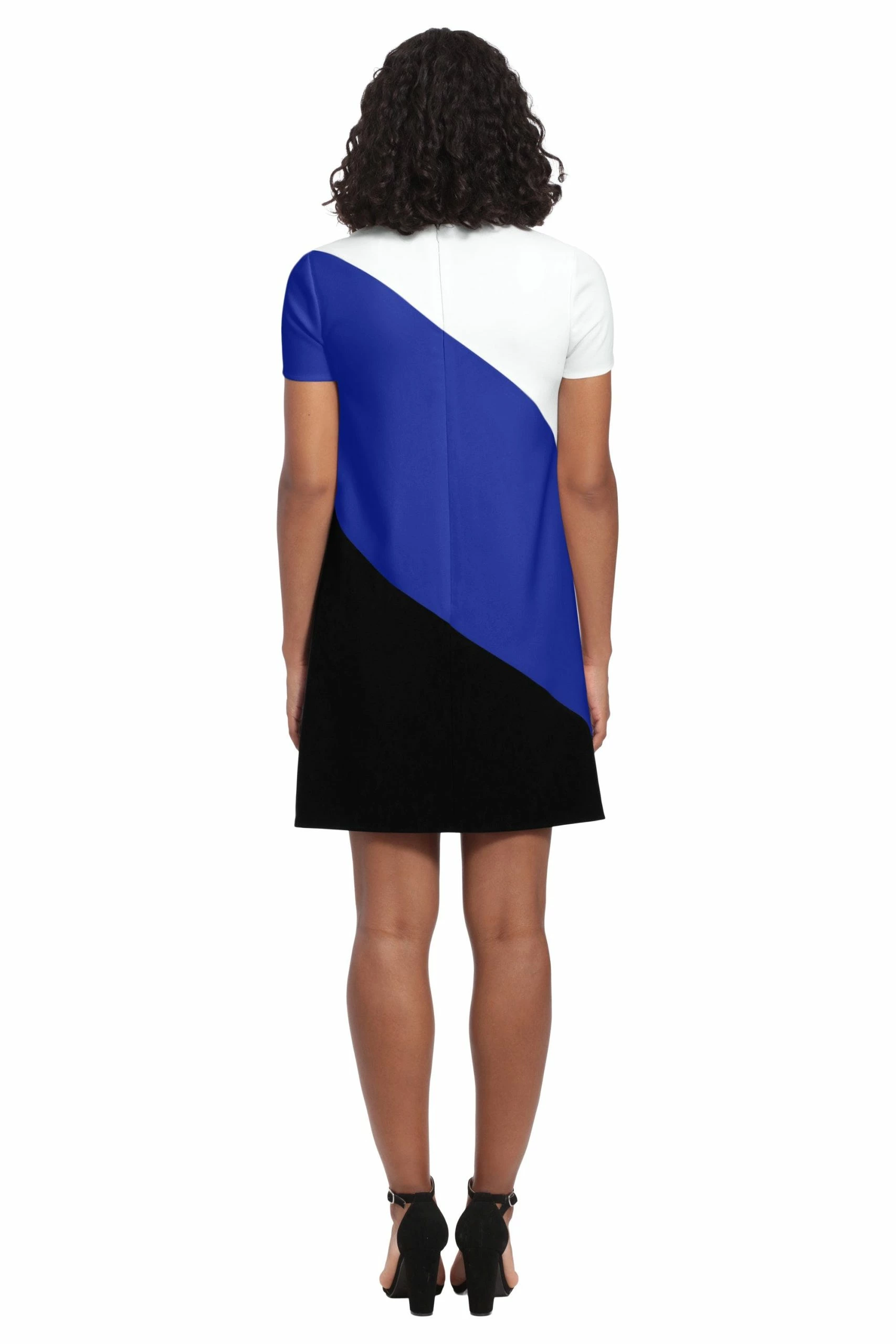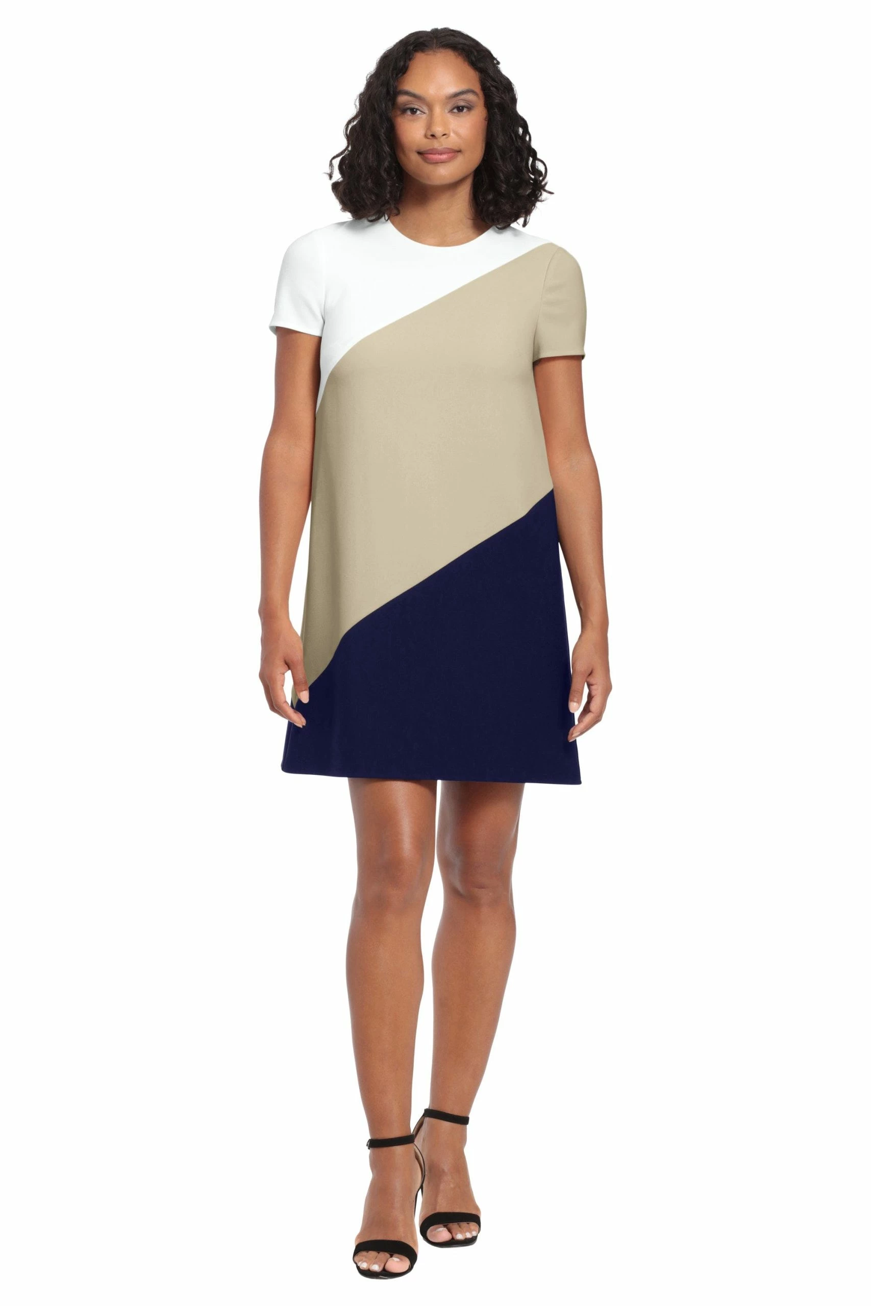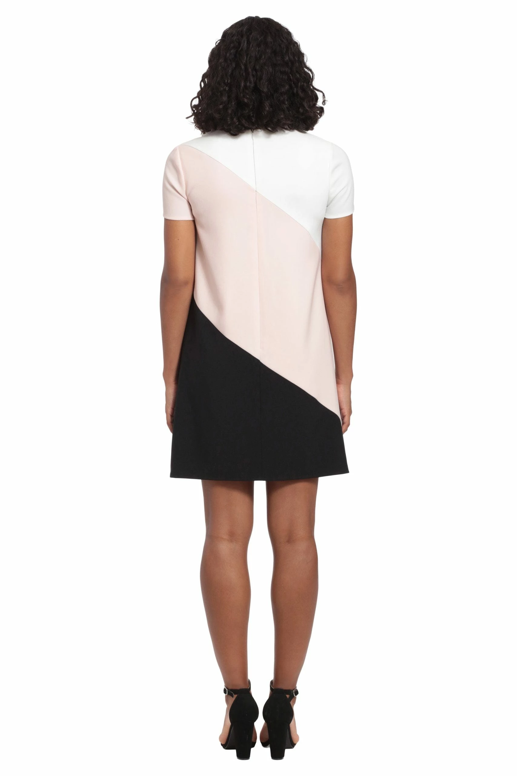 This tri-color mini is Everest. You love her easy sheath dress silhouette and short sleeves.