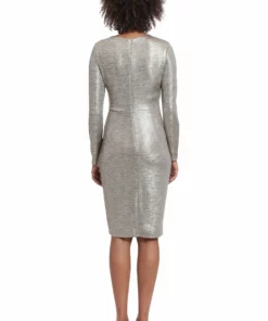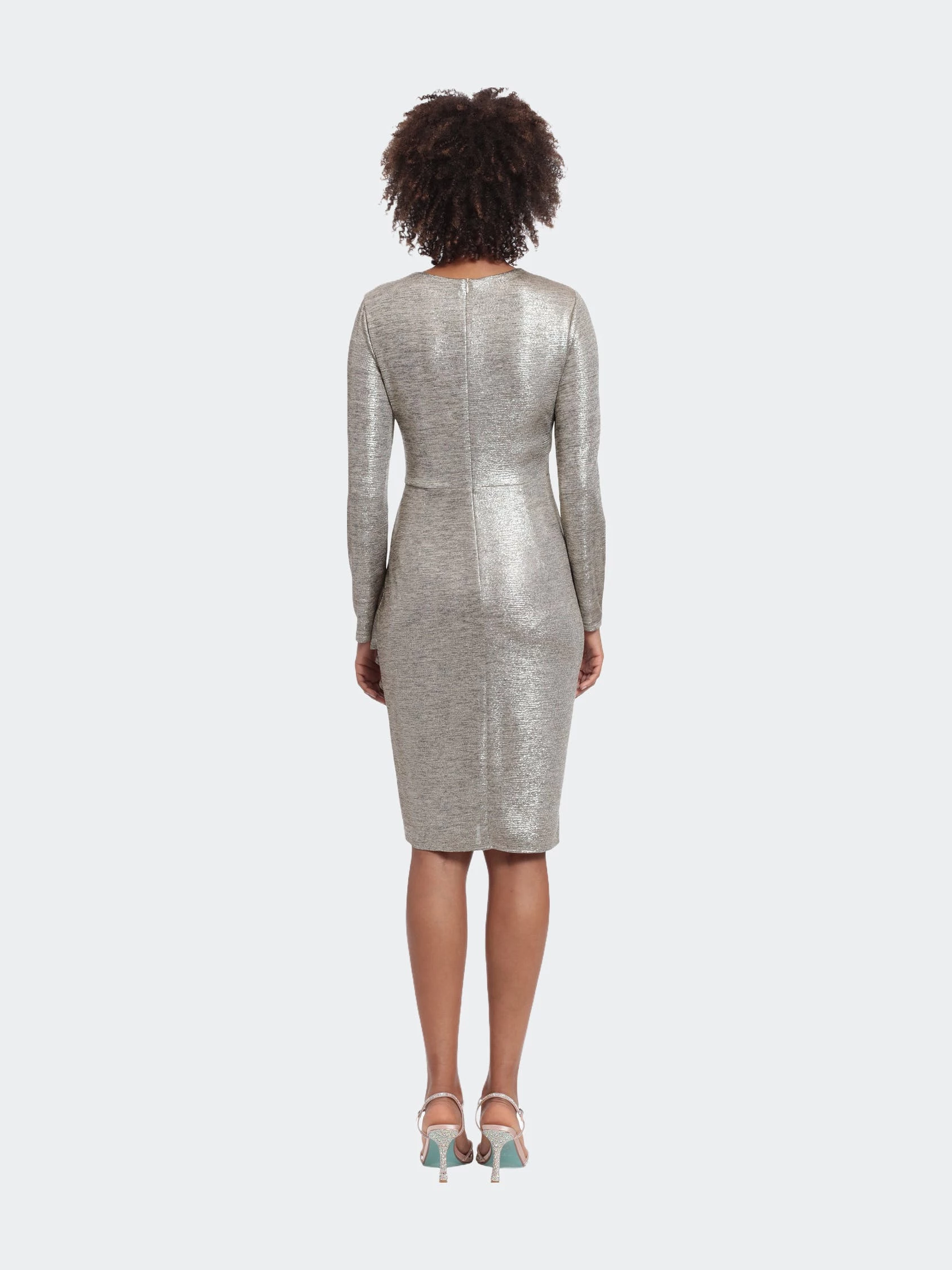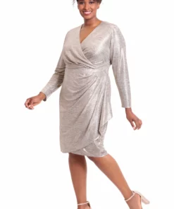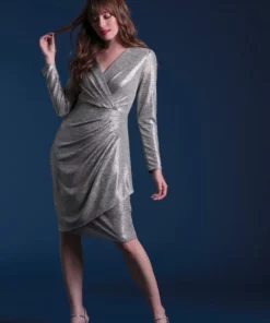Meet Nalia, a golden knee-length dress with tons of attitude. London Times adore her faux-wrap bodice and long sleeves.