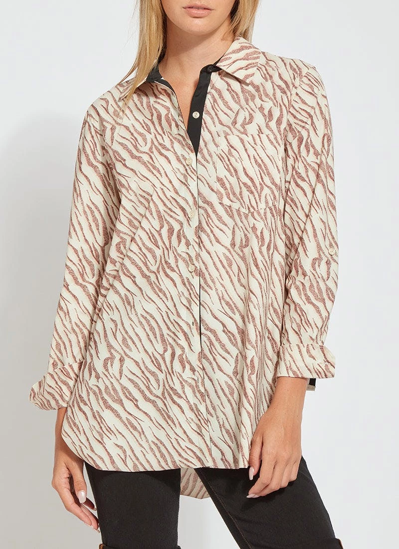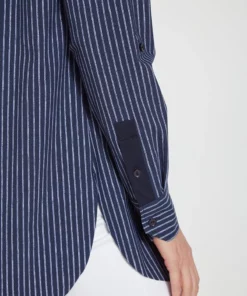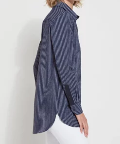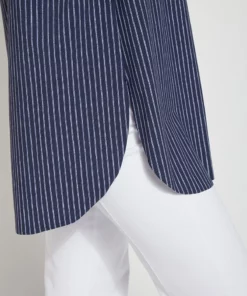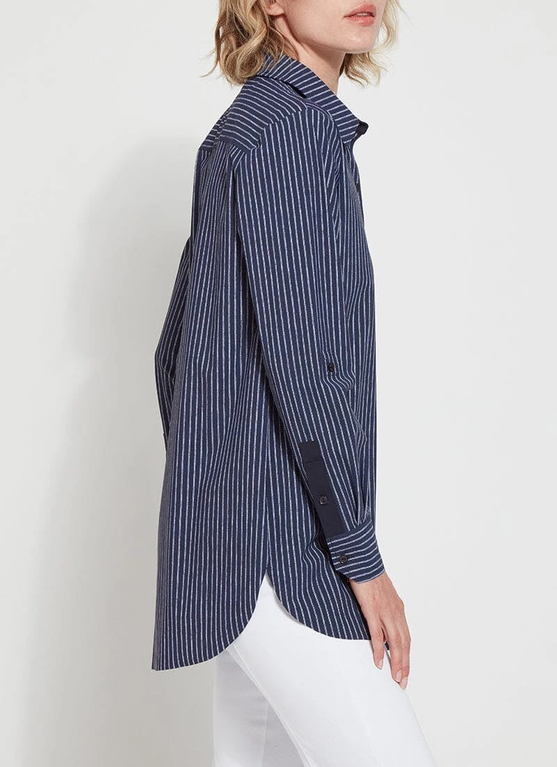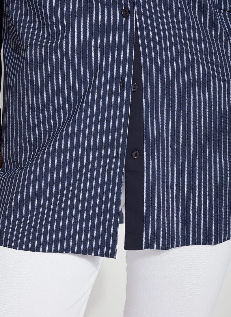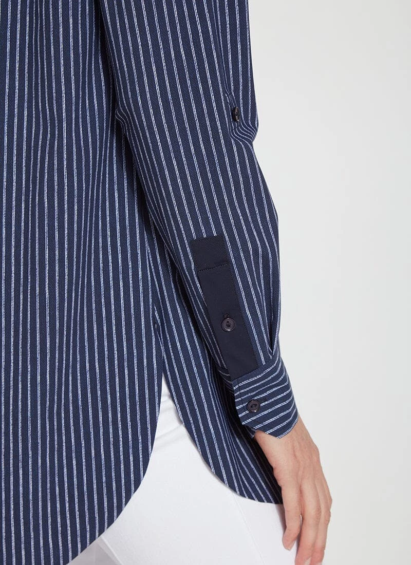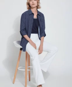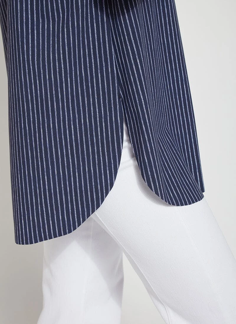 The Fashion Schiffer w Contrast Printed – made from soft, 4-way stretch Microfiber – offers a single pocket front, legging-friendly length and contrast-color detailing in True Navy. It resists wrinkles and offers a rounded, legging-friendly hem. Showcase favorite women’s shirt, in menswear-inspired Oxford Pinstripe, with a True Navy Classic Top and Lyssé’s matching Denim Trouser Pattern, in Indigo Double Pinstripe.