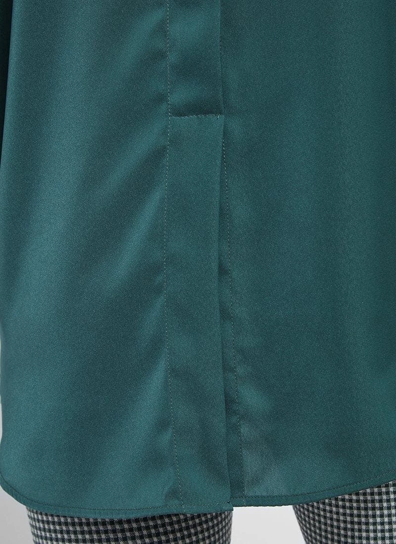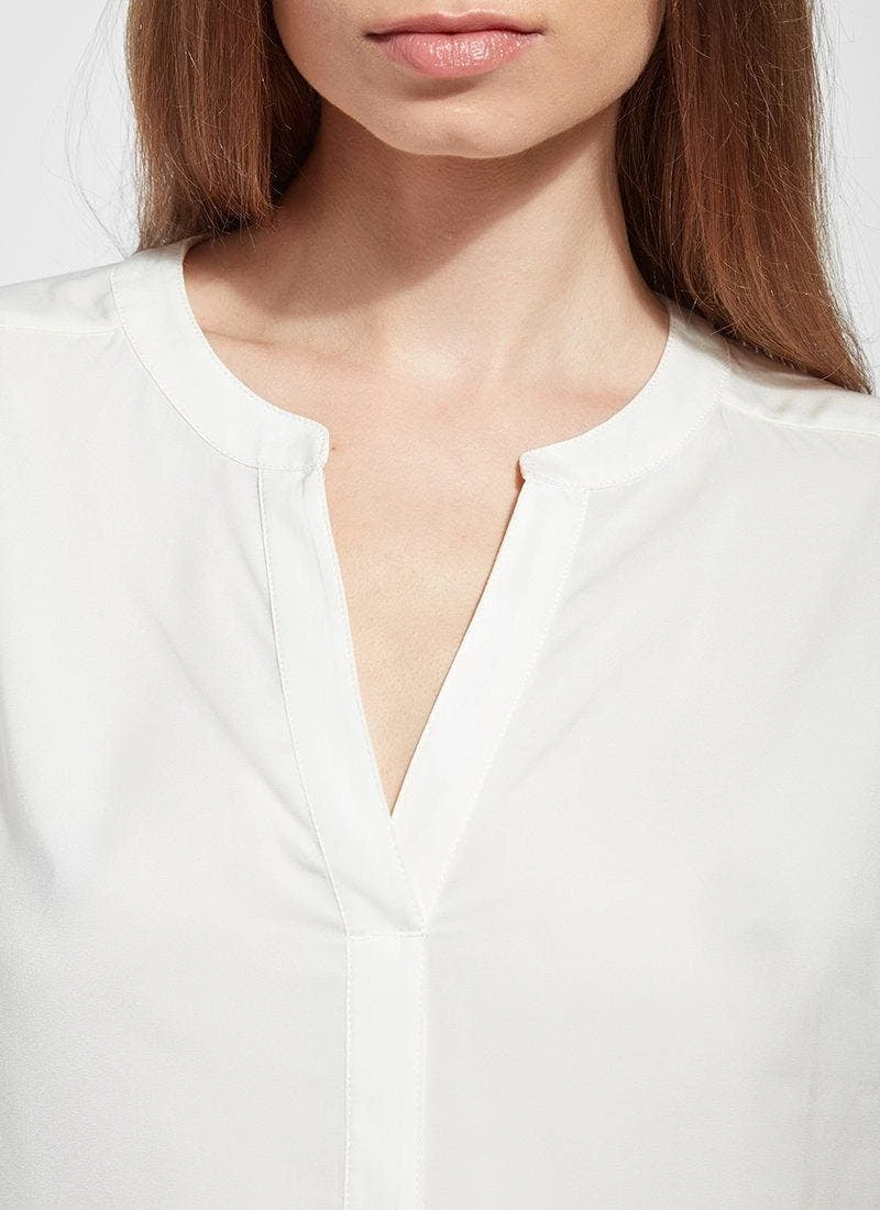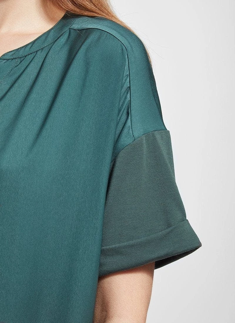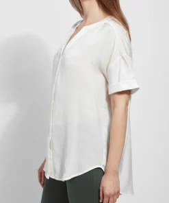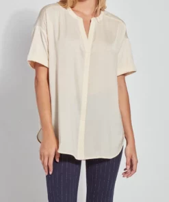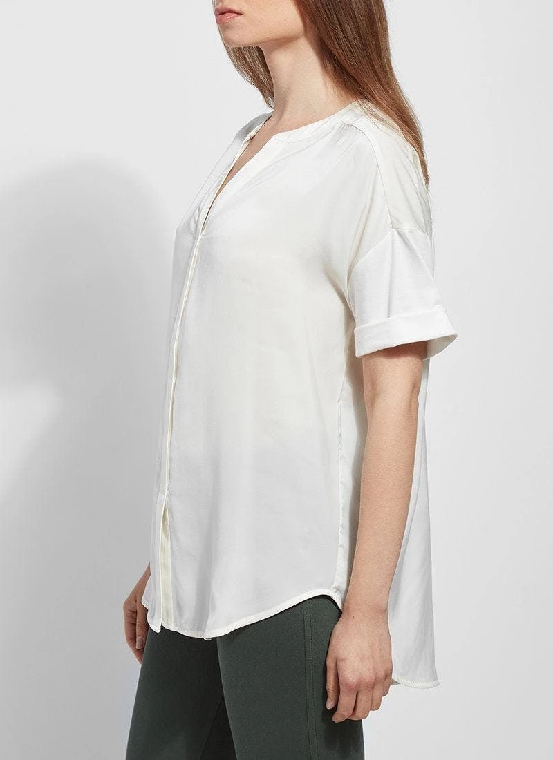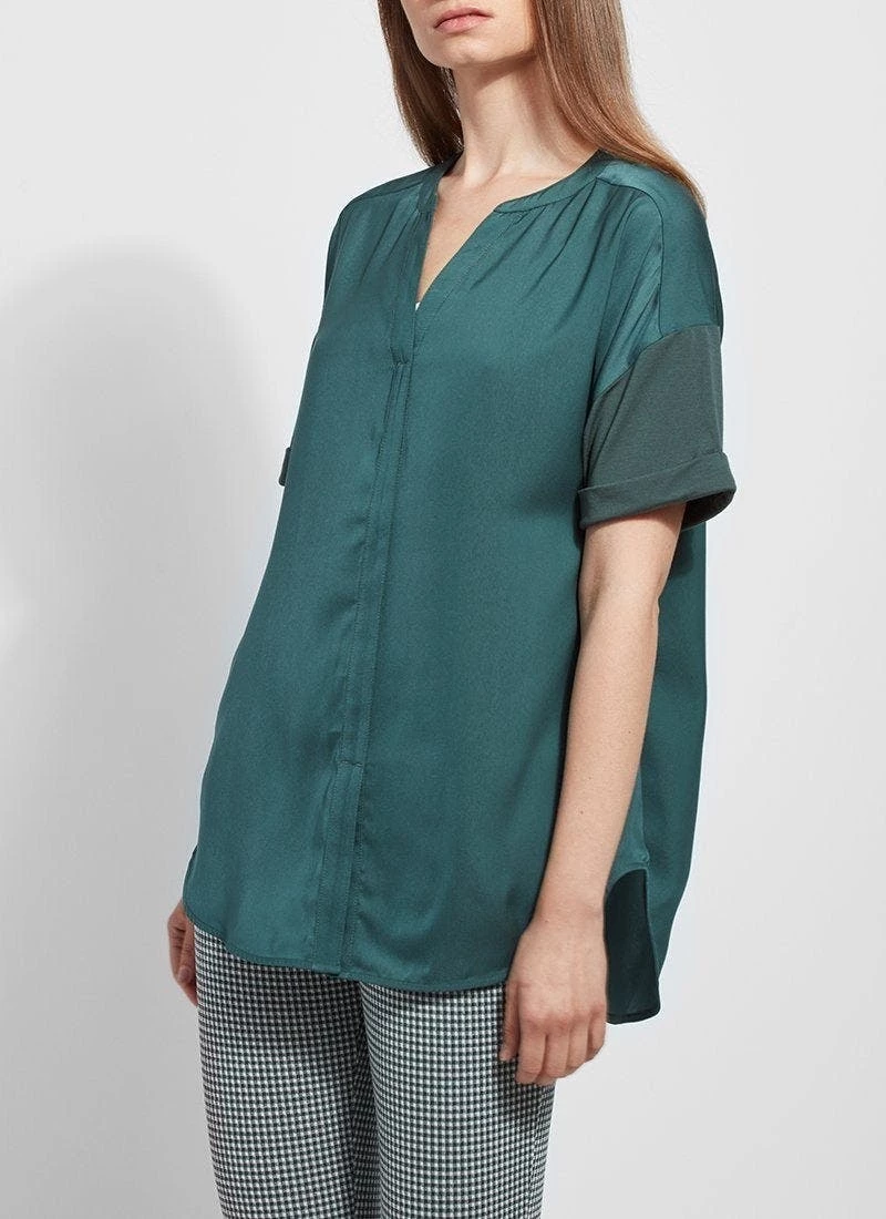 Flowy and oversized, the Leah Short Sleeve Top combines a silky Lightweight Satin body with stretchy, knit Jersey sleeves for elevated style and comfort. Meticulously constructed, this classic top features a clean front placket, center-front vent, rounded high-low hem, and cuffed, drop-shoulder sleeves. Offered in two colors, this pull-on top shines when belted over bootcut jeans. Complete the look with sable leather mules, a backpack and brimmed hat. Upon delivery, steam or hand iron to remove wrinkles.