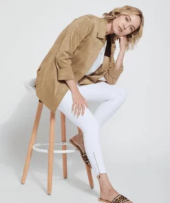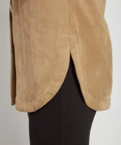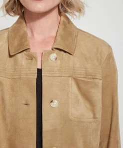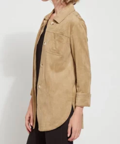 The straight fit Lori Lt Vegan Suede Overshirt is a perfect spring-into-summer jacket to layer over tees, leggings and wide-leg pants. Crafted from 4-way stretch Lightweight Vegan Suede, this faux suede shacket features faux horn buttons, a front patch pocket and a legging-friendly, rounded shirttail hem. Detailing includes an interior yoke lined with Trico mesh; decorative topstitching on the collar, sleeves, front and back yoke; and sleeves that can be cuffed to bracelet length.