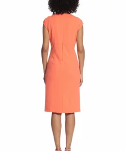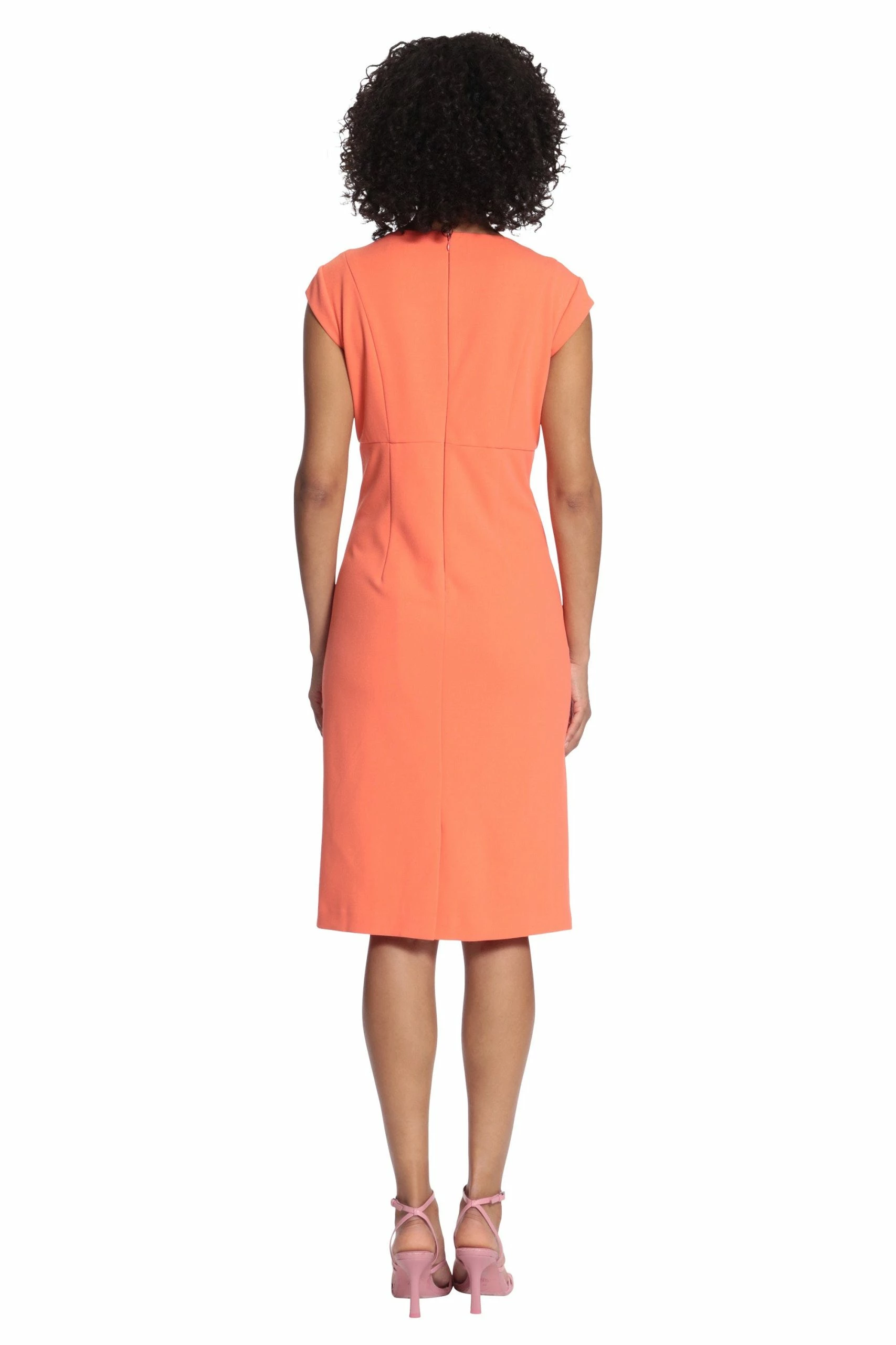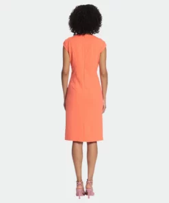 This cool, coral midi is Izara. We love her flattering, gathered bodice and uniquely cut neckline!