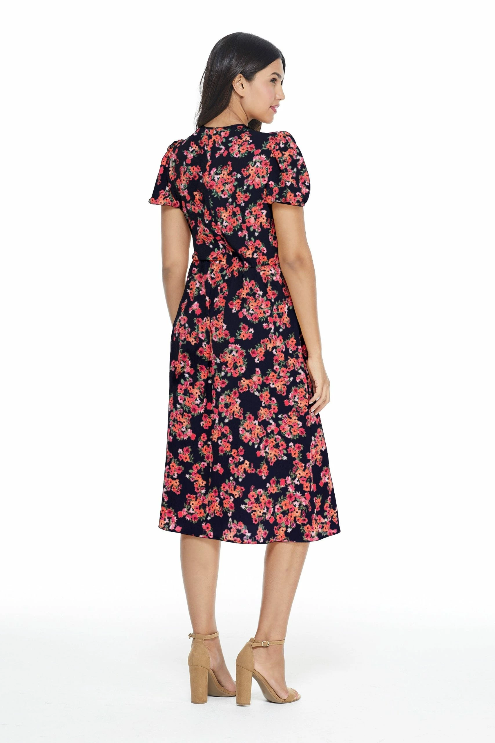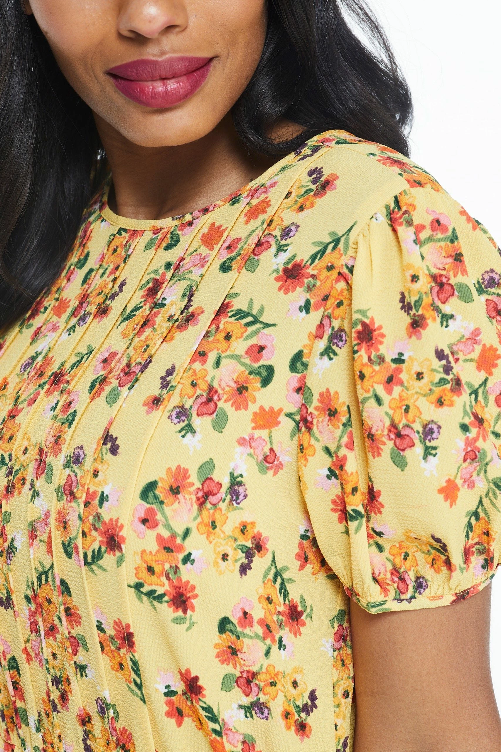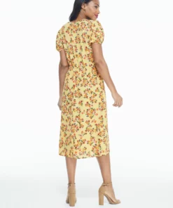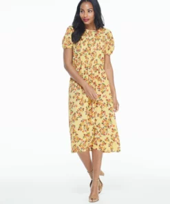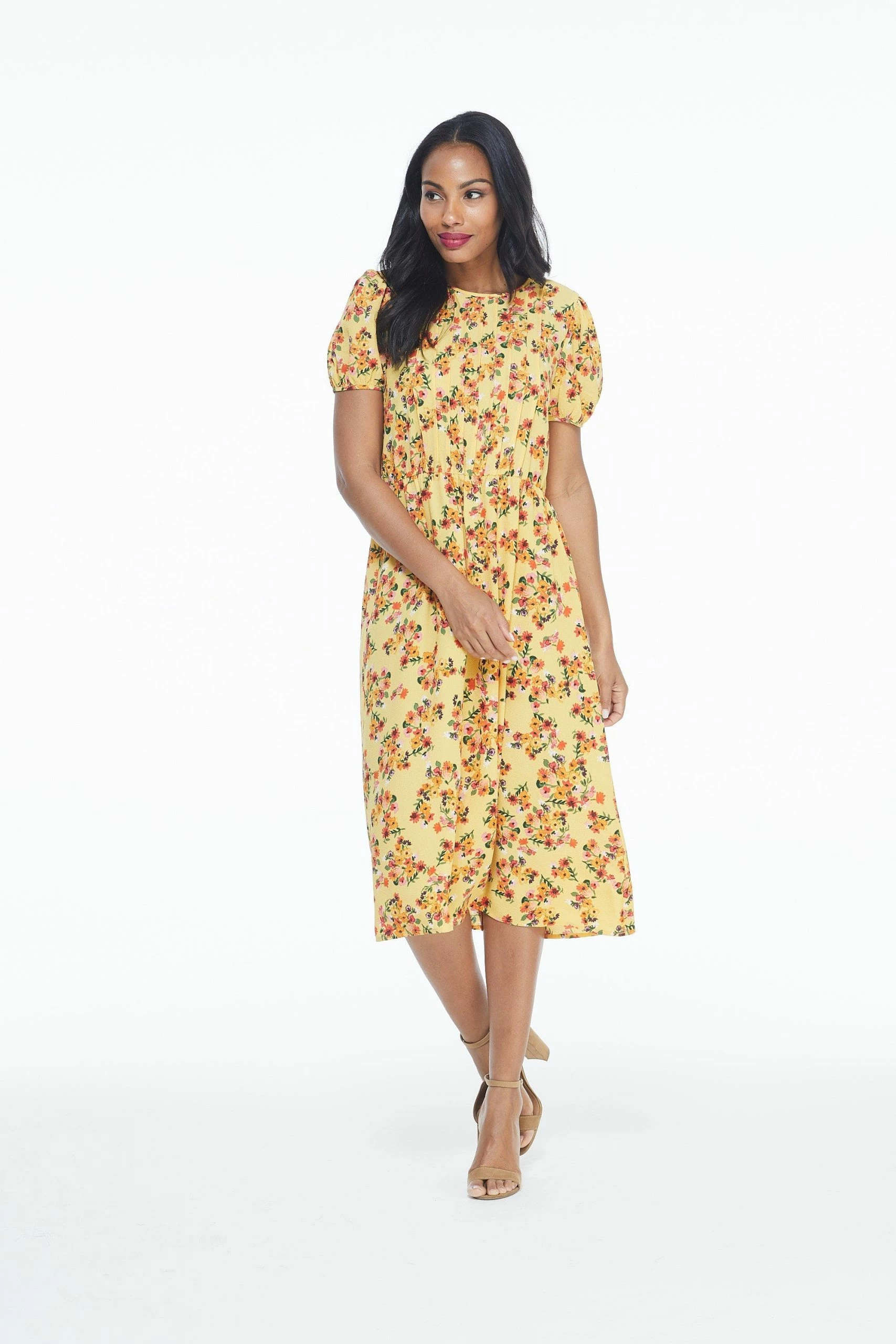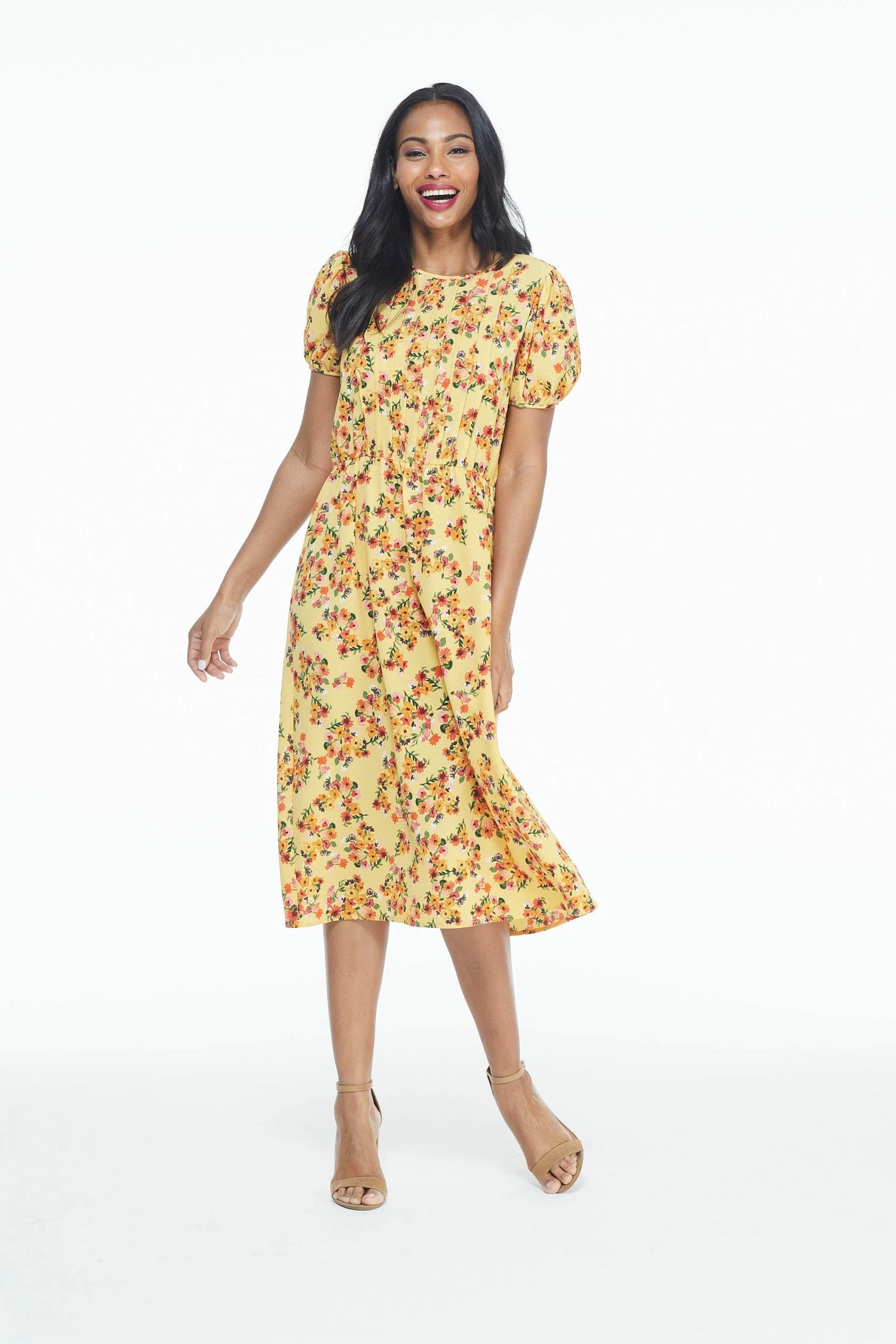 Introducing the camara dress. This springtime design features a chic floral pattern on a bold, yellow bubble crepe. Its puff sleeves and pleated details along the bust take a nod toward vintage inspo.