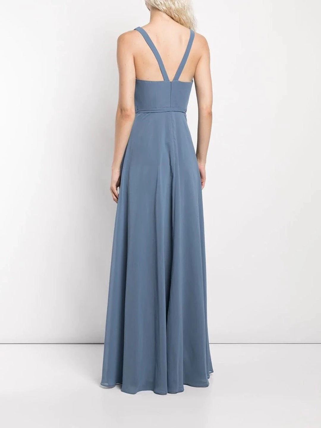 Bloom all year round in the Aprilia full length deep v-neck, blue chiffon gown, featuring a romantic hue, a graceful waist tie, plunging neckline, and a charming double strap at the back.