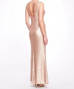 Illuminate the night in the Atrani gown in rose gold. Featuring a striking gathered waist, a luminous sequin hue, and an effortless leg slit.