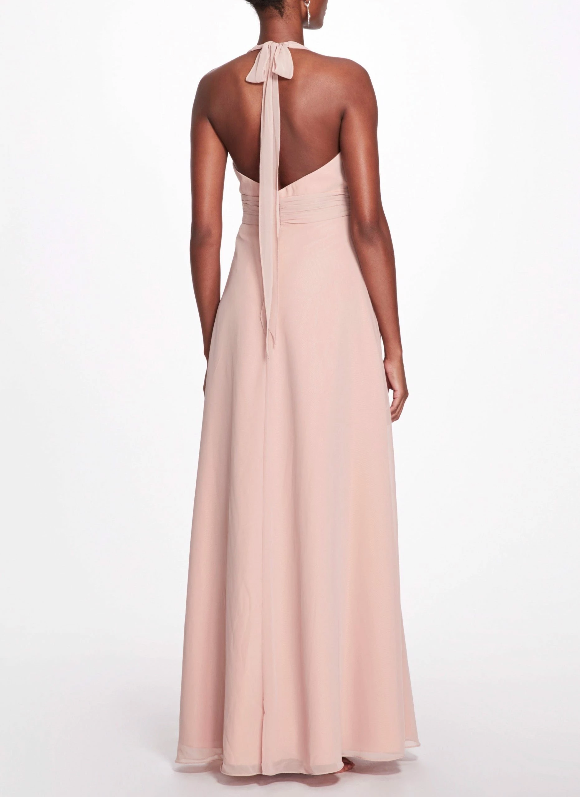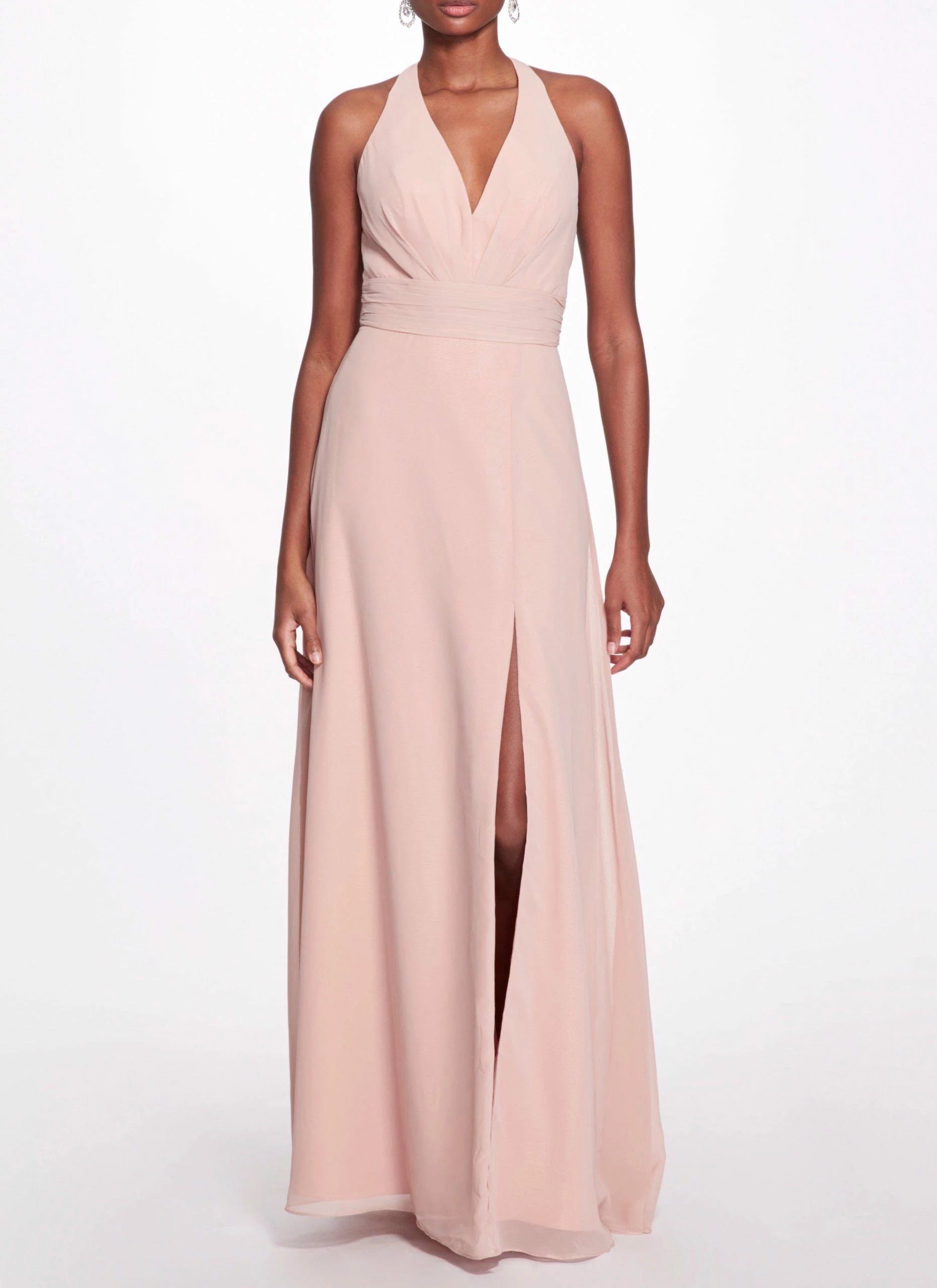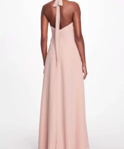 Evoke a feeling of modern elegance in The Aversa Gown. Featuring a timeless silhoulette, a romantic open back and a classic leg slit.