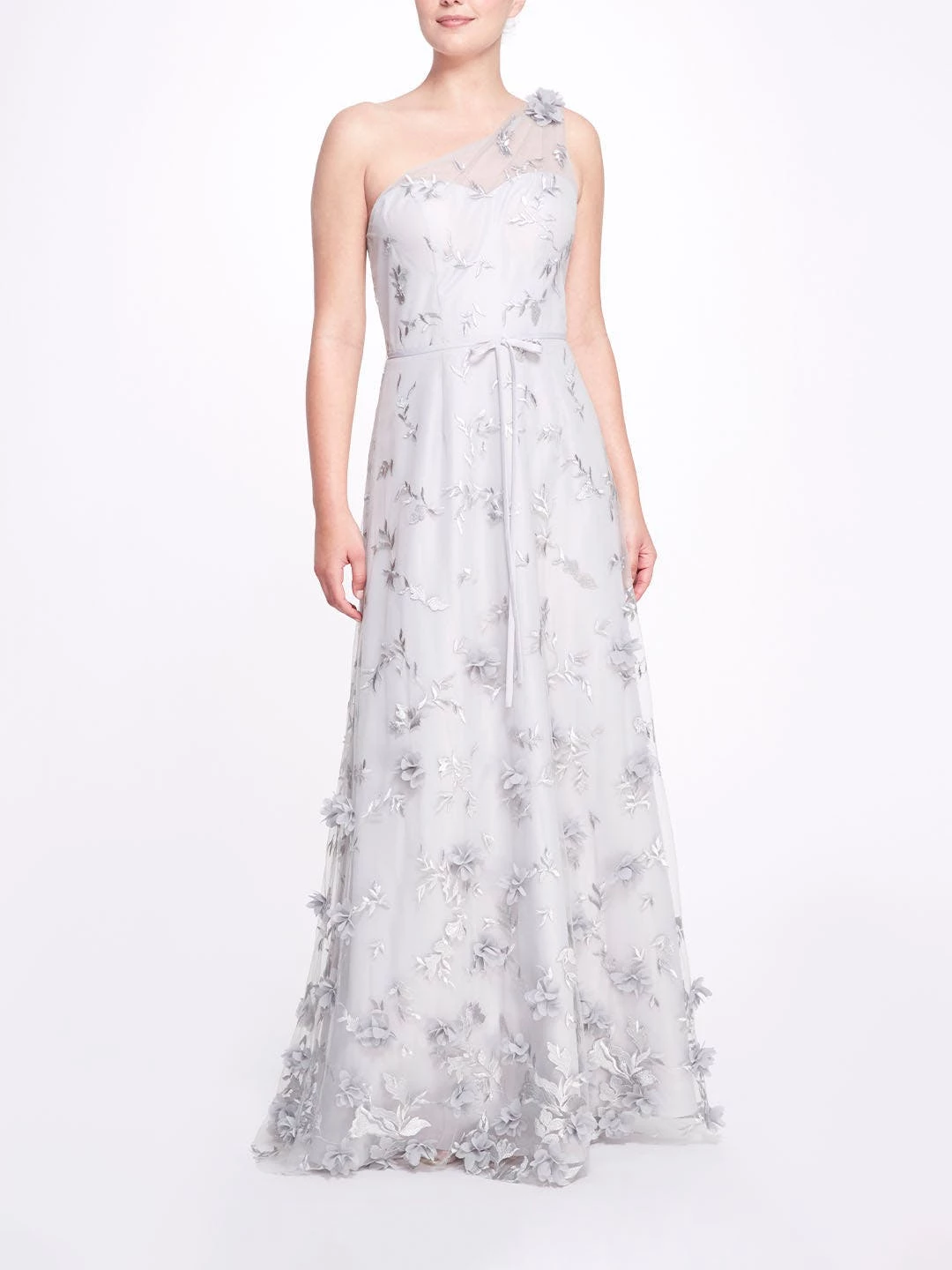 The Bari gown in dove grey features a sweetheart neckline with a tulle one-shoulder overlay, a dainty tie waist, and sprawling 3D floral appliqués.
