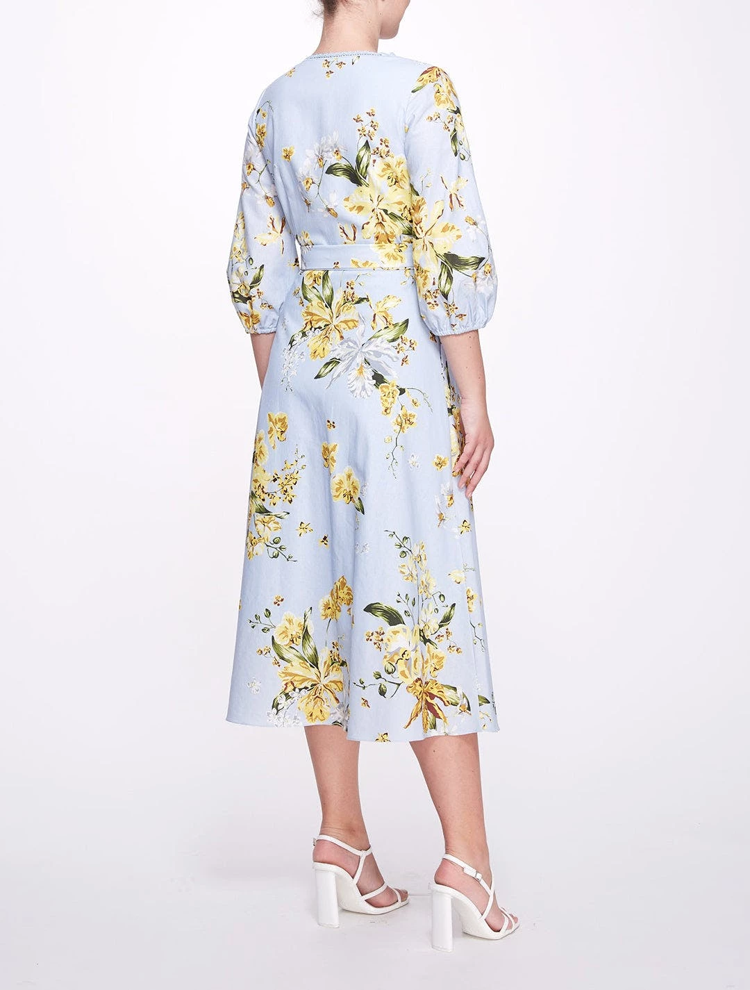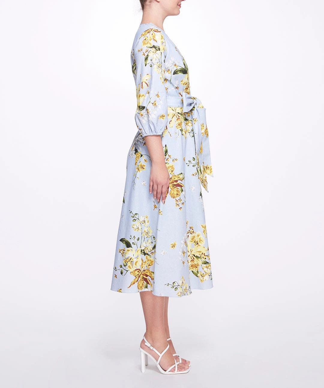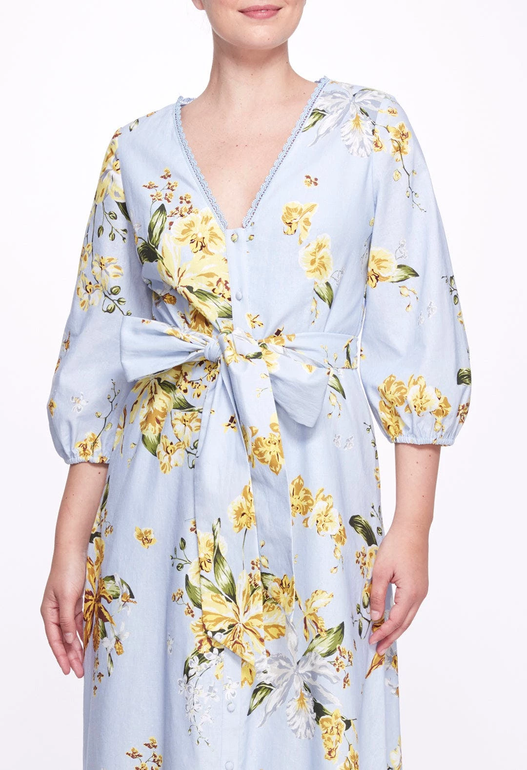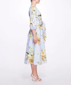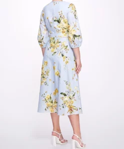 Exuberant in florals, the a-line midi dress with balloon sleeves in dusty blue features an a-line silhouette, trimmed v-neck, and a bow tie belt to create an elongated hourglass figure. Charming in floral print cotton poplin, it’s the perfect addition to any lovely wardrobe.