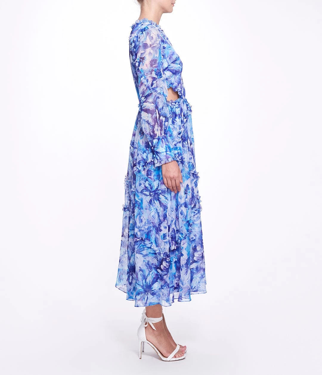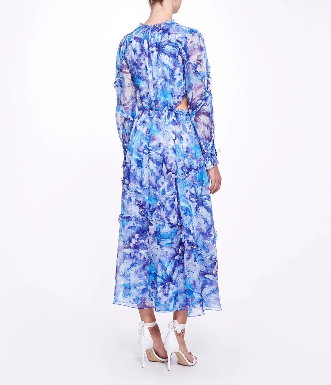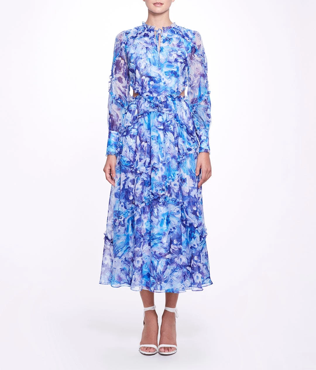 Abstract floral printed chiffon long sleeve A-line midi dress with waist cutout, full bishop cuffed sleeve, interlacing ruffle detail and center front keyhole with tieModel is 5’9″ wearing a size 6.