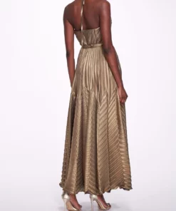 The personification of elegance, this tea-length dress in gold features a halter neckline, foiled georgette fabric, with a pleated bodice and chevron pleated skirt.