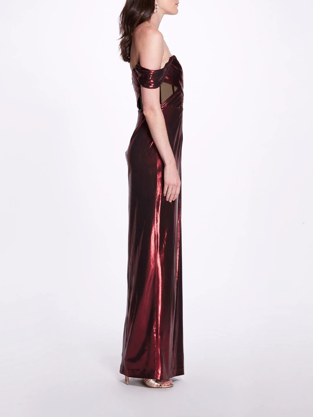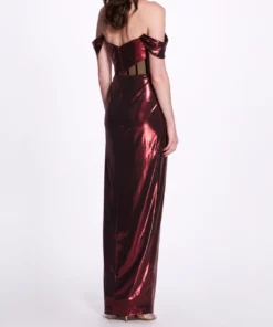 The charm of glamour, this floor-length gown in red features an off-the-shoulder sweetheart neckline, pleated lamé, a knee-high slit, and crisscross details going around the cut-out bodice.