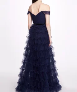 The appeal of tiers, this mauve floor-length gown in navy features tulle off-the-shoulder sleeves, a bowed sweetheart neckline, fish wire tiers, and a black velvet accent.