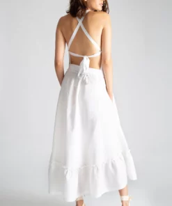 Pretty enough for a wedding on the Amalfi Coast and effortless enough for a night of dancing in Ibiza. This is our freshest, most feminine take on the classic summer dress. What makes it so special? Just whirl around. The open back is sweetened with a precious grosgrain-ribbon tie and the white linen whispers against your summer skin. The billowing skirt begs you to mingle and dance the summer away.