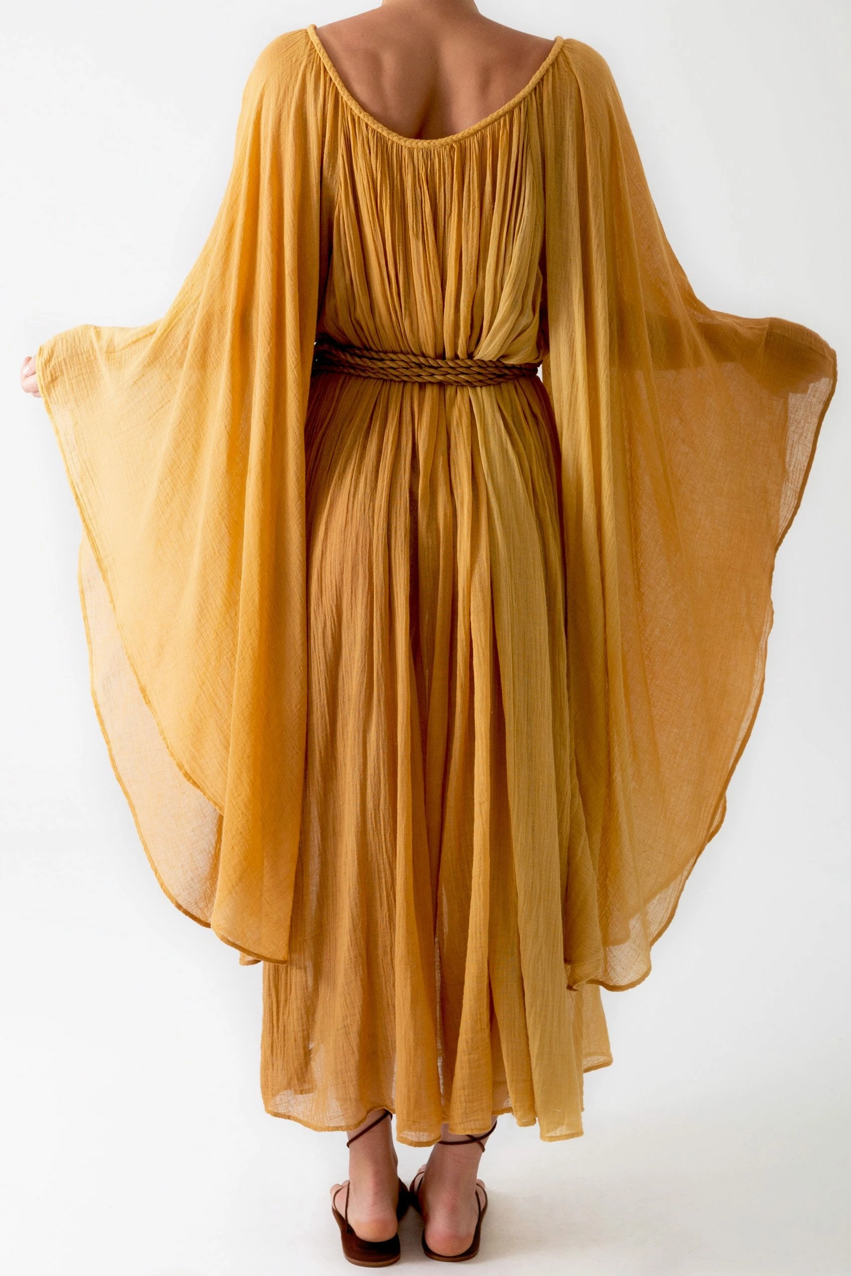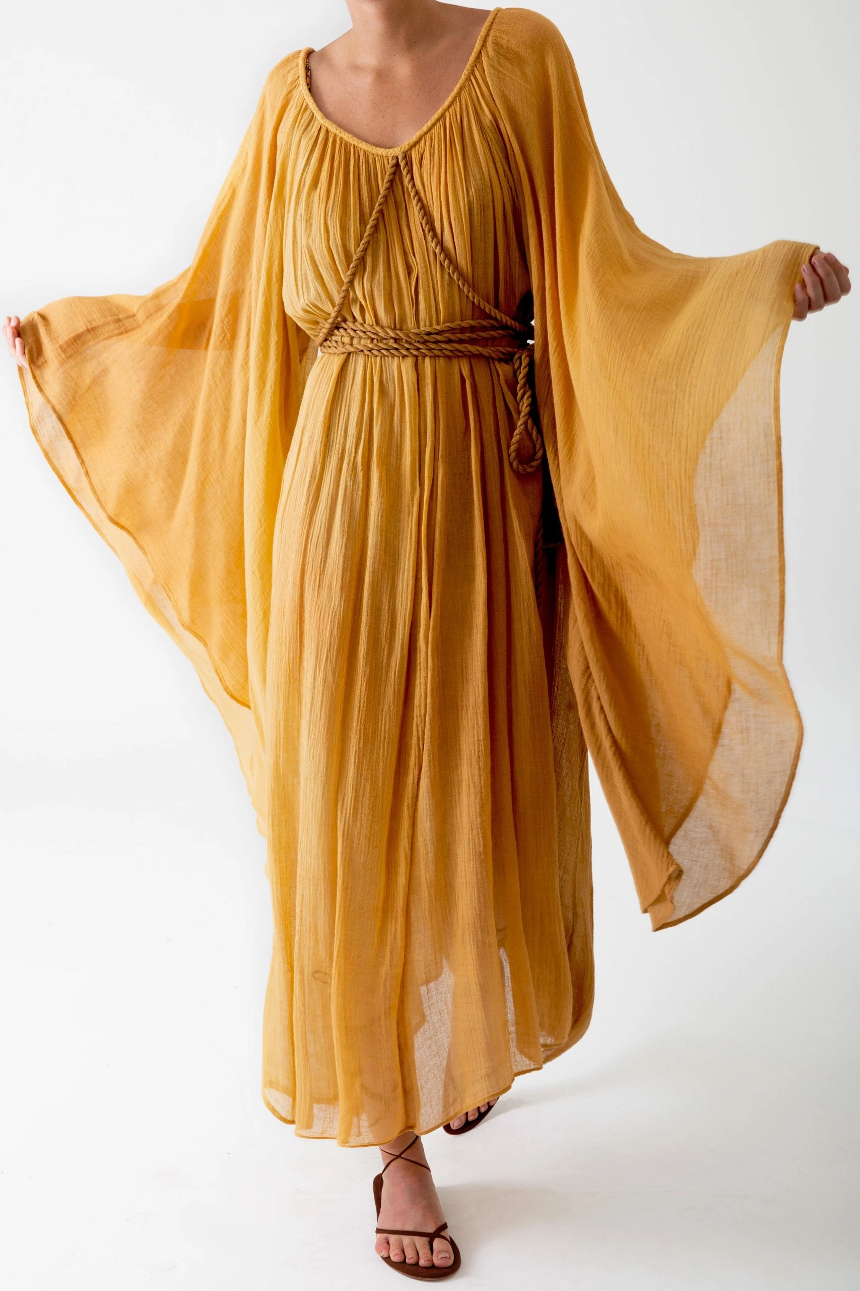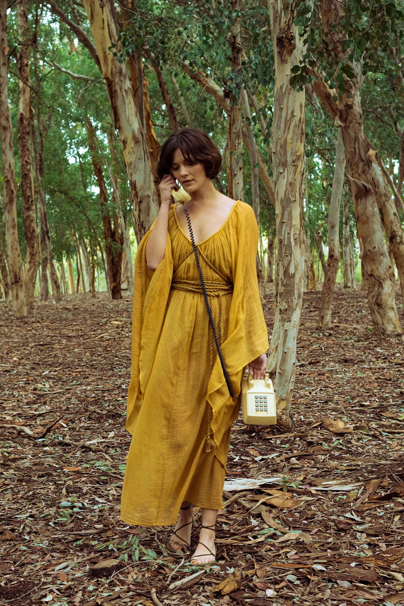 With its layers of tie-dyed gauze and accents of braided rope, our new Nevaeh is borderline Romanesque. The rope wraps around your waist for a classically romantic fit, and the gauze billows around you as you walk into the bar. Oh, did we mention the sleeves? You can practically swim in them. Because each piece is dyed by hand, no two are ever the same.