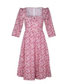 Marisol is a dress with a low, wide, portrait-collar neckline, elegant French darts from waist to bust, puffed shoulders, and an effortless, gathered skirt with pockets, of course. She is made from an exclusive pastoral-print cotton toile. A Marie Antoinette silhouette, simplified and made into an effortless dress.