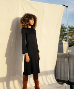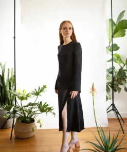Nina is a luxurious, long-sleeved, silk slip dress. She has curved seams and a thigh-slit. She slips overhead with a keyhole and shell button at her nape. She’s made of silk with a touch of stretch for a flattering fit.