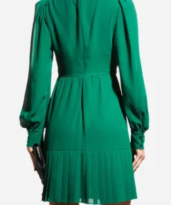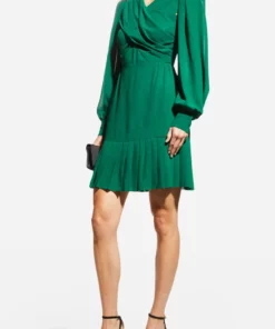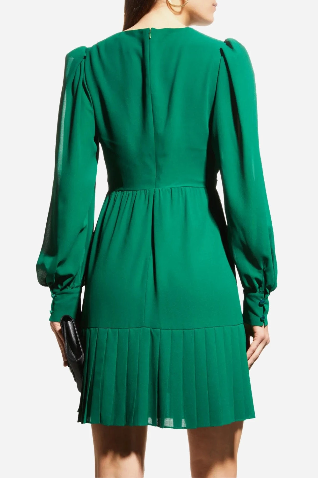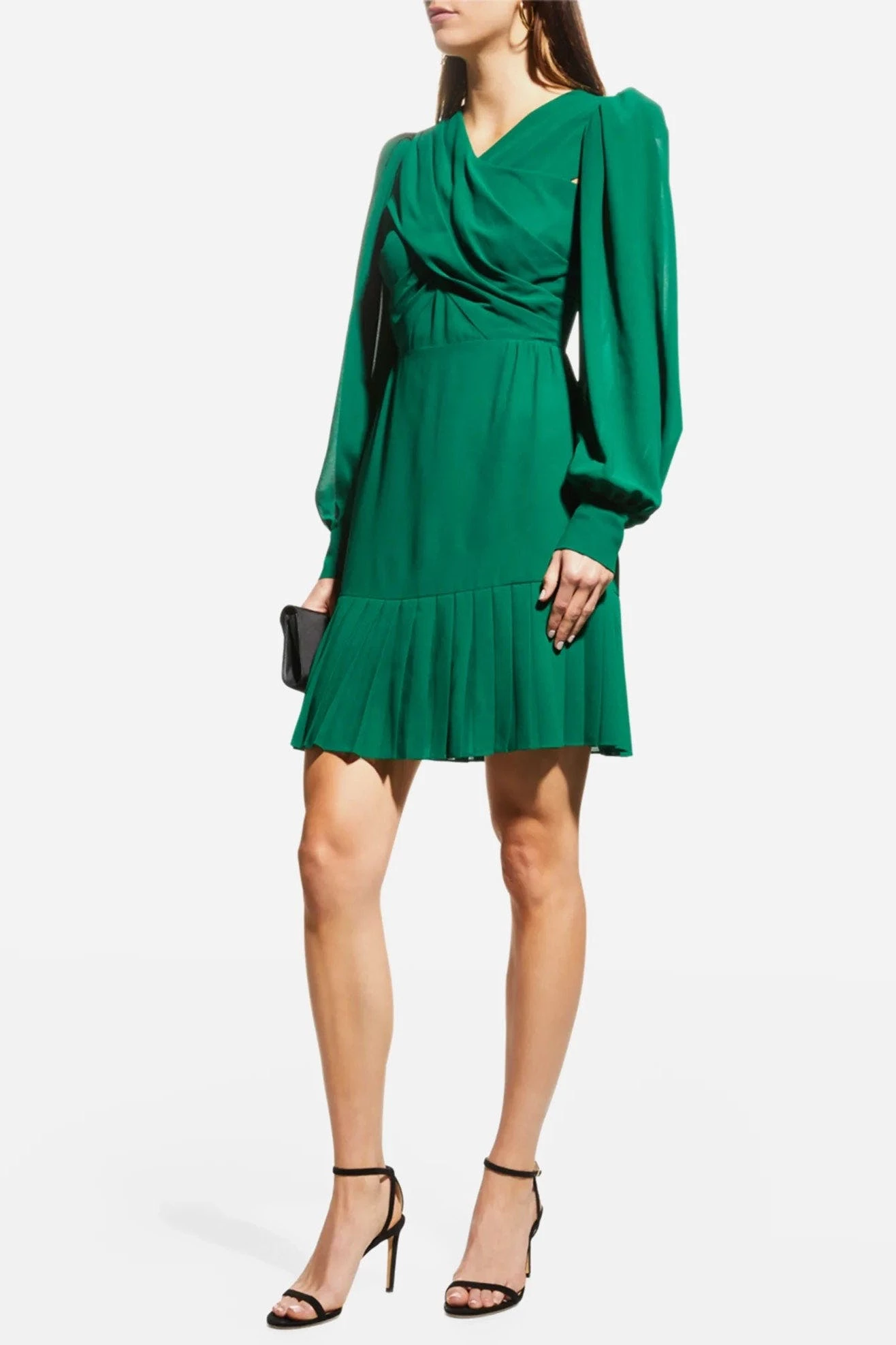 Day and night. The Fiona’s working overtime. This emerald pleated dress can take you from Sunday brunch to an evening cocktail party all you need is a change of shoes. The Fiona day-to-evening cocktail dress has a faux wrap bodice and blouse-like long sleeves. Its modest neckline pairs well with the shorter hemline giving you the best of both worlds.