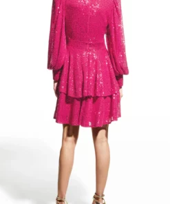 – Fuschia sequin tiered cocktail dress with sleeves.