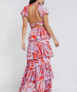 This ONE33 Social maxi skirt is sure to bring out your inner party animal. This animal zebra print tiered skirt is a fun and flirty addition to your spring wardrobe. The bold red and lilac colors in the print make for the perfect beach wedding guest dress. This matching set is the perfect conversation-starting wedding guest dress, vacation outfit, or show-stopping maxi dress for that upcoming day-to-evening special occasion. If you’re looking for a sign to book a one-way ticket somewhere fabulous, this is it. Recommend pairing The Natasha Skirt with The Natasha Top (as seen here) for your special event. However, you can also pair this skirt with that boyfriend button-down or a sweater for brunch the next day––two birds with one killer skirt!