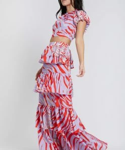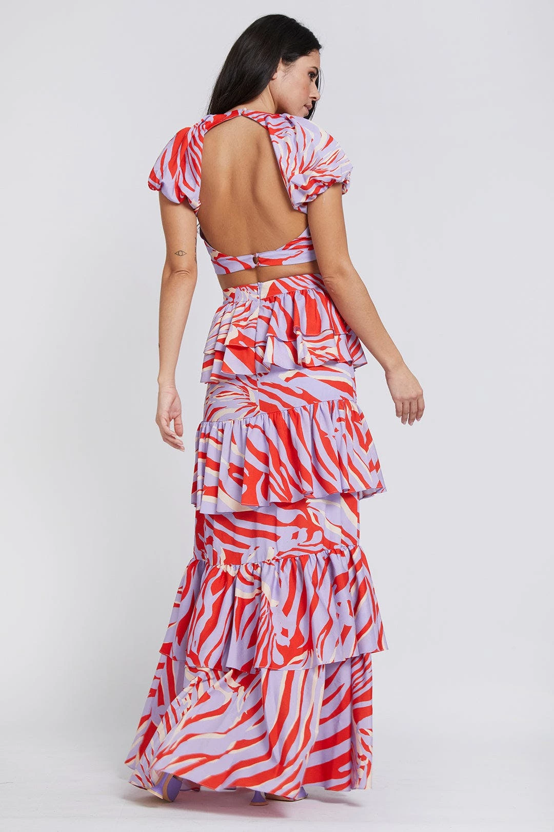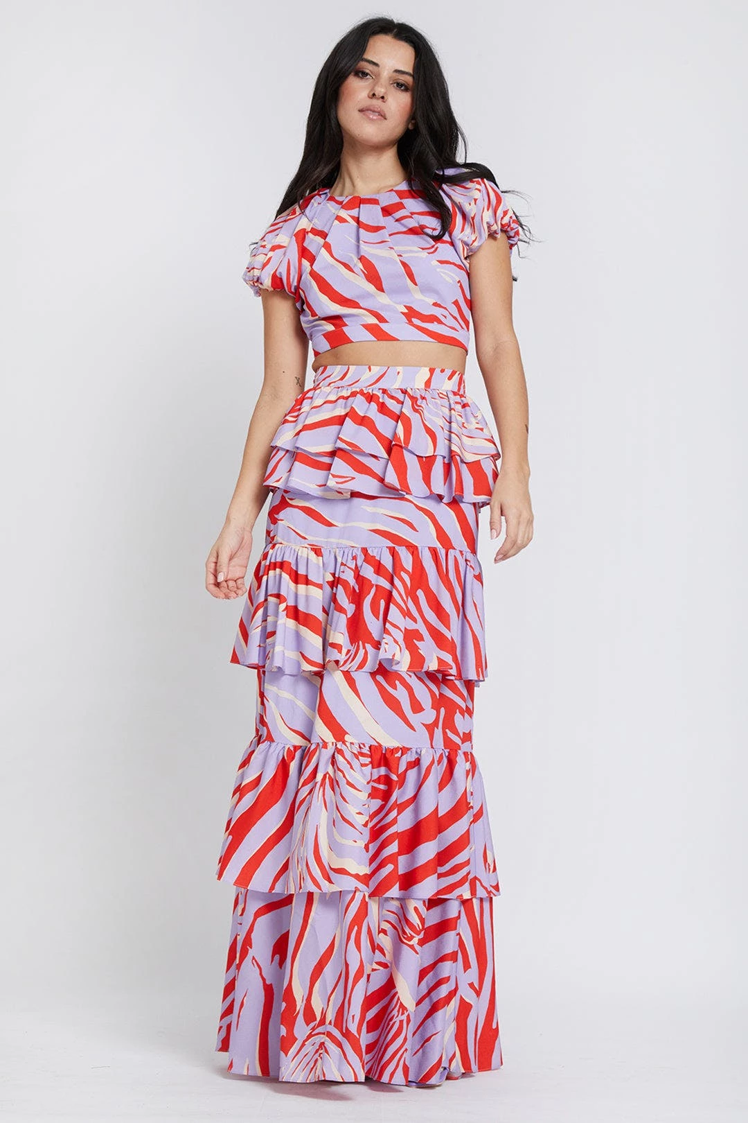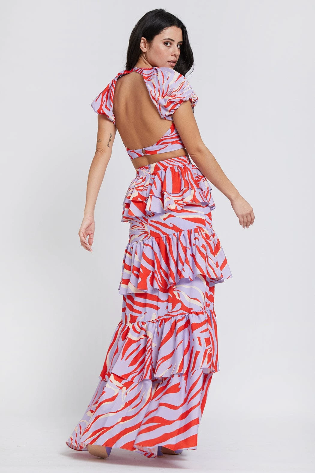 – Zebra animal printed crepe de chine maxi skirt with a tiered ruffle hem