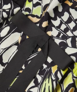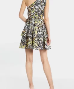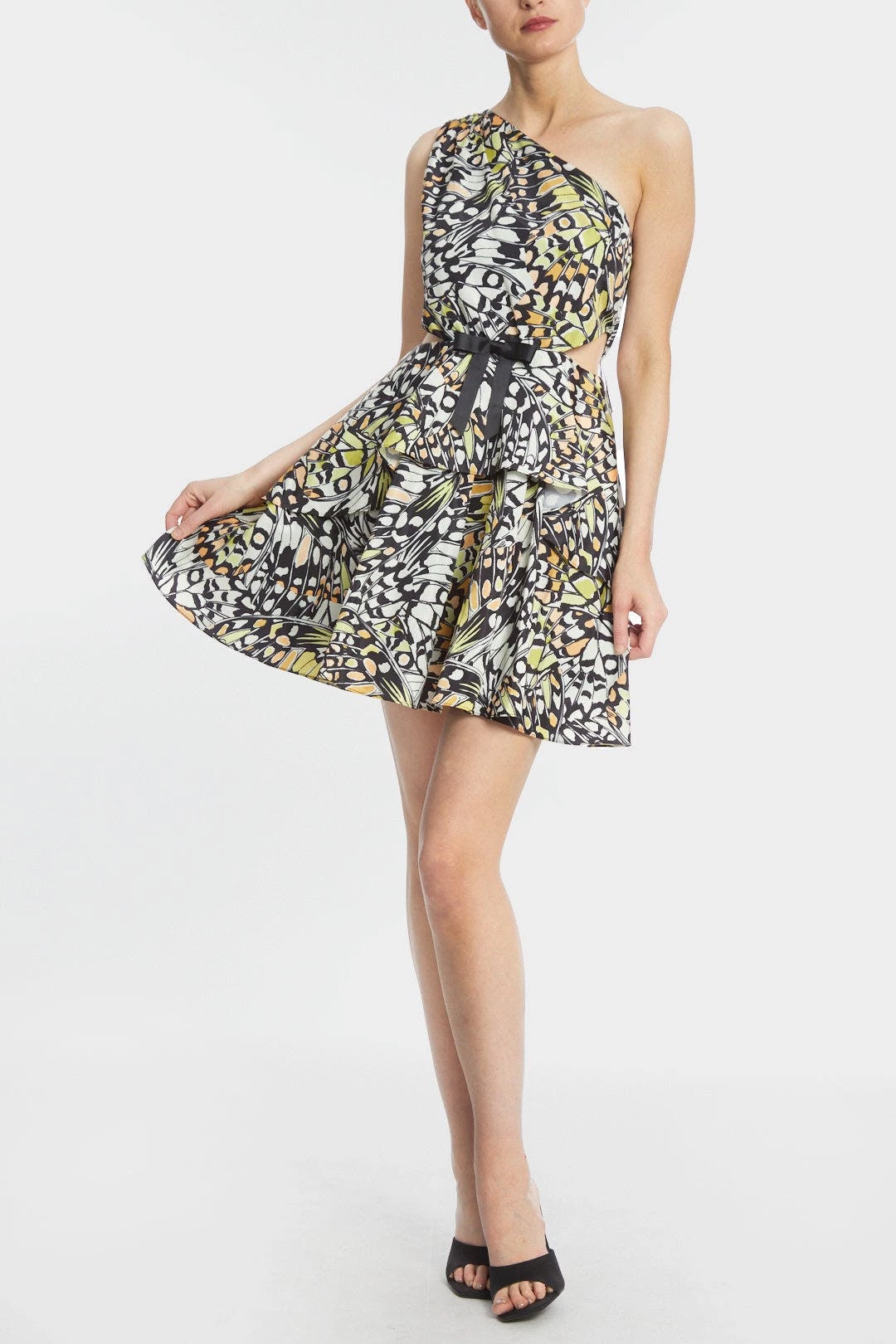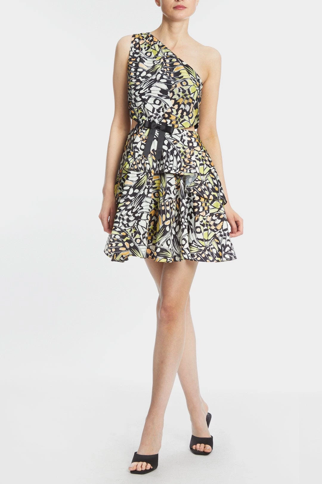 Short and sweet. The Papillon is straight out of a holiday rom-com.This one-shoulder mini dress features side cutouts, an adorable black grosgrain bow at the waist, and a three-tiered a-line ruffled mini hem. Its multi-colored yellow & black taffeta butterfly-inspired print is both bold and feminine. Dress it up with pumps or down with heeled boots or both. The Papillon is the perfect day-to-night number and is a must-have for your vaca holiday wardrobe.